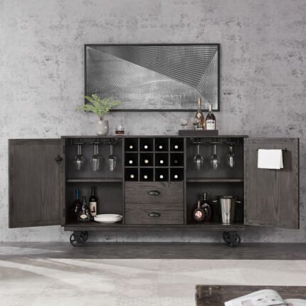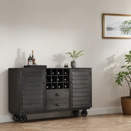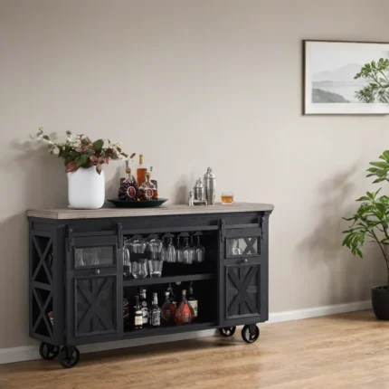 Designed for practicality, this bar trolley features ample storage space for your favorite spirits, glassware, and bar essentials. The sturdy construction, coupled with smooth-rolling wheels, ensures ease of mobility, allowing you to effortlessly navigate your space while hosting gatherings or enjoying quiet moments.