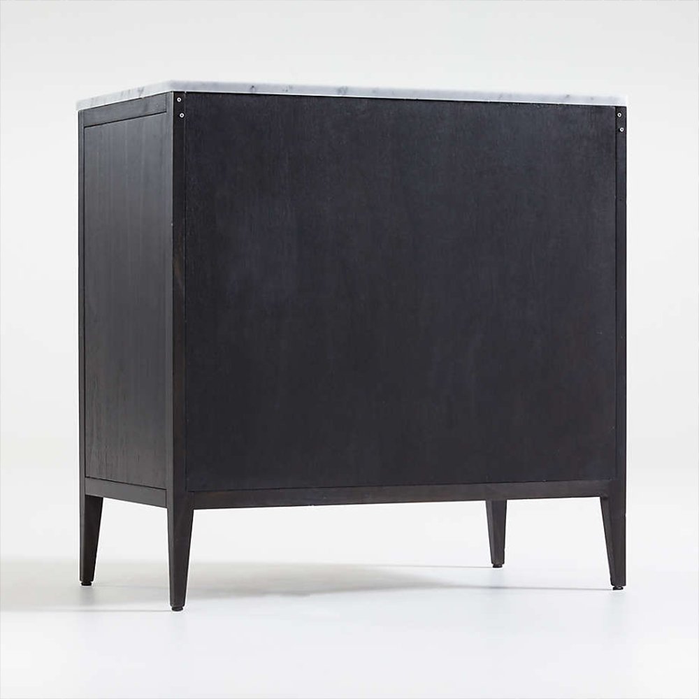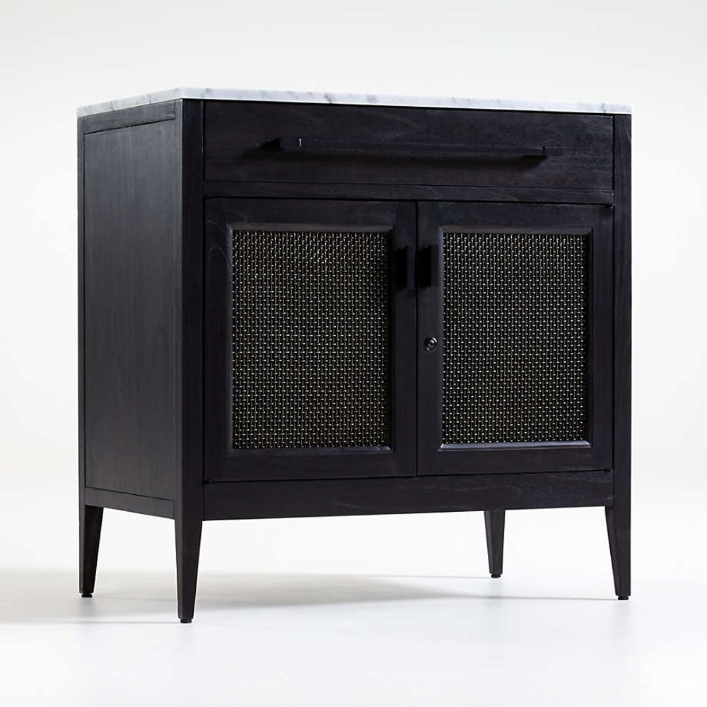 A modern mix of materials comes together in this multitasking bar cabinet. Carrara marble provides a luxurious work surface and dramatic contrast to the black-finished mindi wood cabinet. Featuring locking doors inset with black metal mesh, the cabinet conceals a wine glass rack and two adjustable shelves that flip to ridged surfaces that nestle four bottles each. Elevated on slender tapered legs.