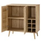 Frances Rattan Bar Cabinet crafted from natural cane and solid wood, our Frances bar cabinet is both beautiful and practical. The cabinet door opens to storage space, with more open shelves to showcase your favorite drinks and decorative items. Natural cane inserts on the cabinet door coordinate with a solid wood handle and legs to create a cozy, earthy look. Size: W 83 x D 39 x H 88.5 cm. Flat packed. Self-assembly required.