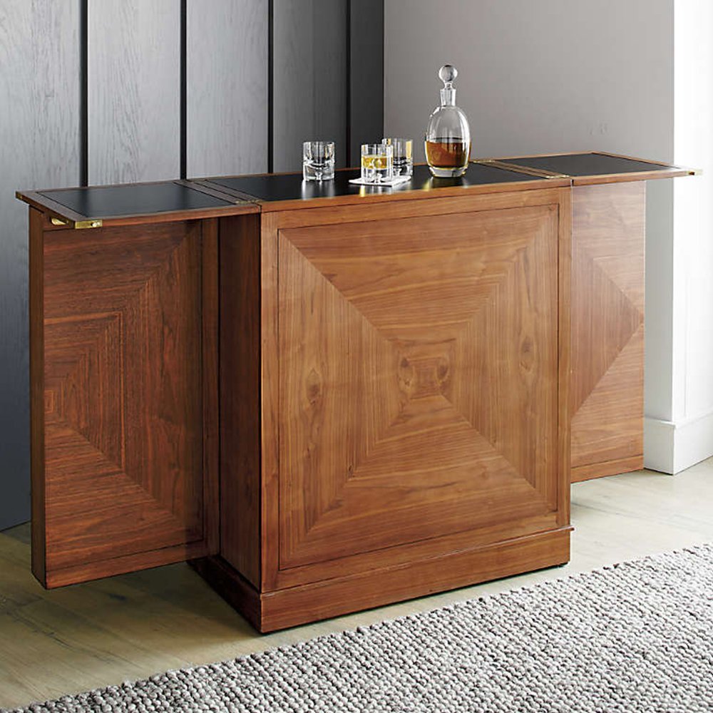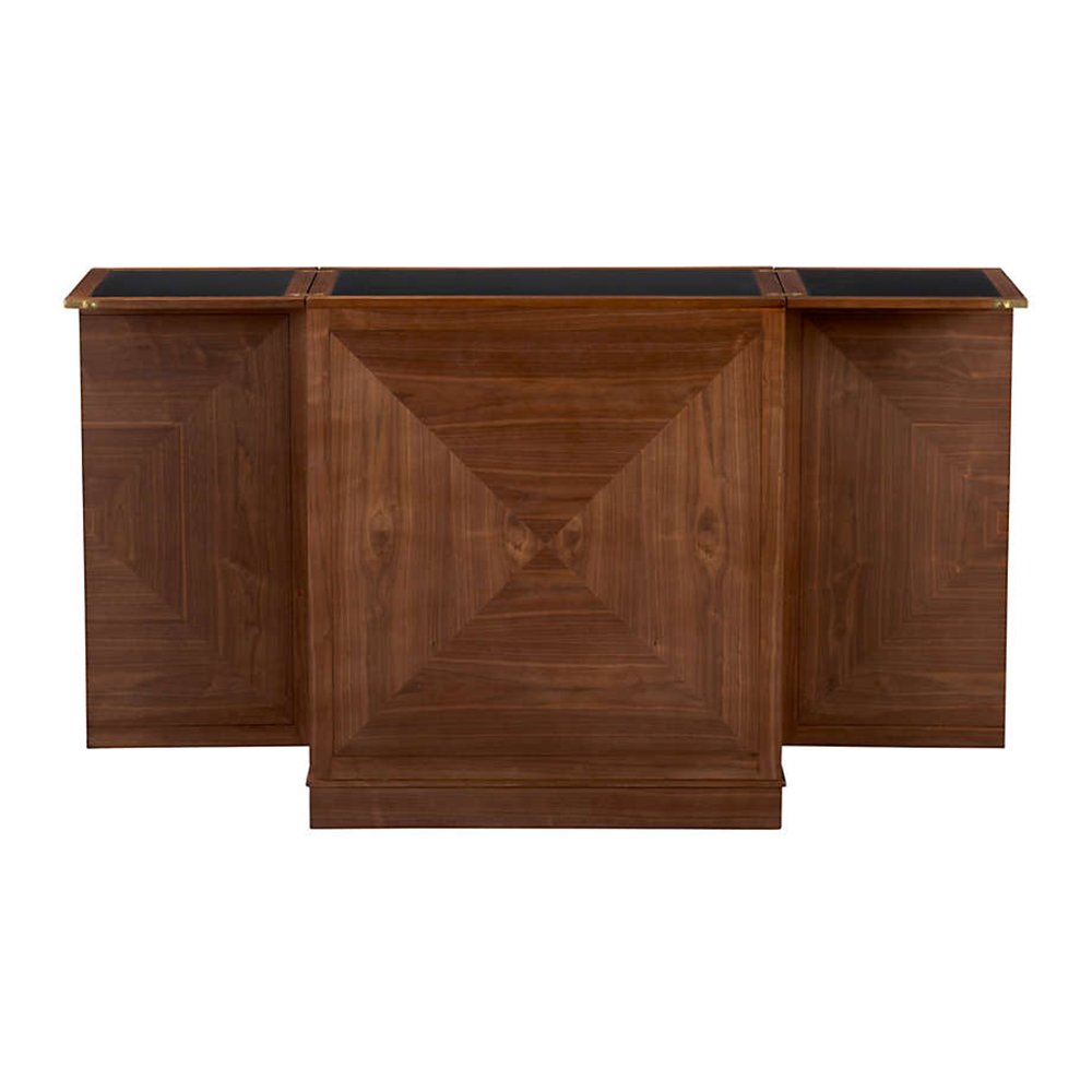 The Valestone Bar Cabinet is a Crate and Barrel exclusive. Piece together gorgeous grain and color in this walnut bar cabinet that’s ready to unfold for instant entertaining. With a flip and pull of the clean-styled brass hardware, the bar is open for business. Finished on all four sides, Maxine can float in a room. Its wood top folds out to an expanded work surface inset with black laminate. The interior is well equipped with racks for stemware, shelves for beverage bottles, and a lower rack for 16 wine bottles. Open shelves and drawer boxes hold bar tools, ice buckets, and supplies.