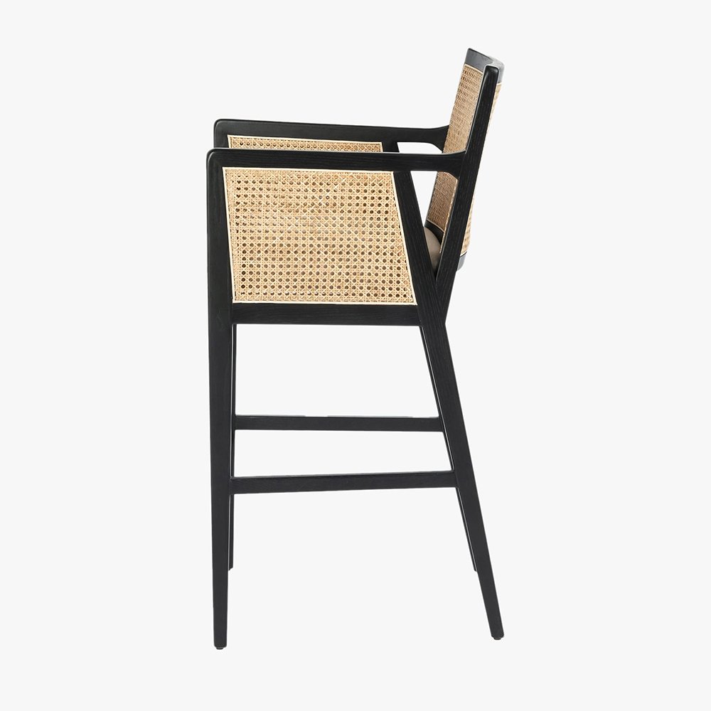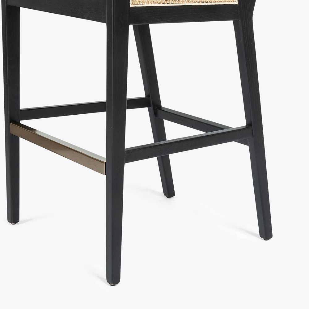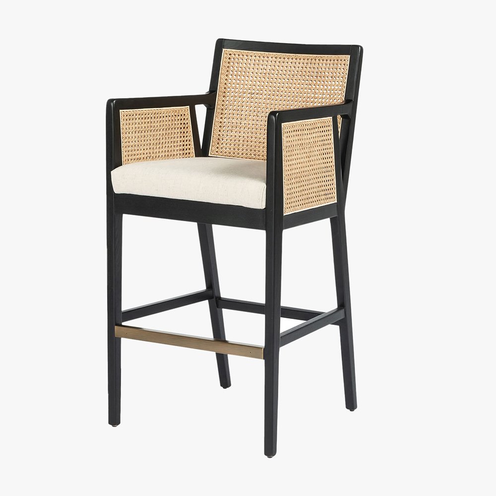 A rich material mix refreshes our bar chair’s retro mid-century modern design. Jaspertrail is carefully crafted of a geometric solid wood frame with inlaid panels of woven cane for beautiful texture. A padded seat cushion covered in a high-performance, linen-blend fabric lends comfort and a tailored look in your kitchen or entertaining area.