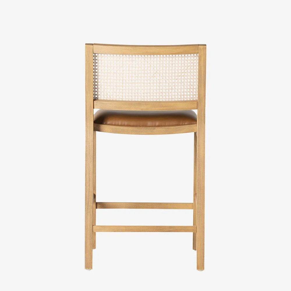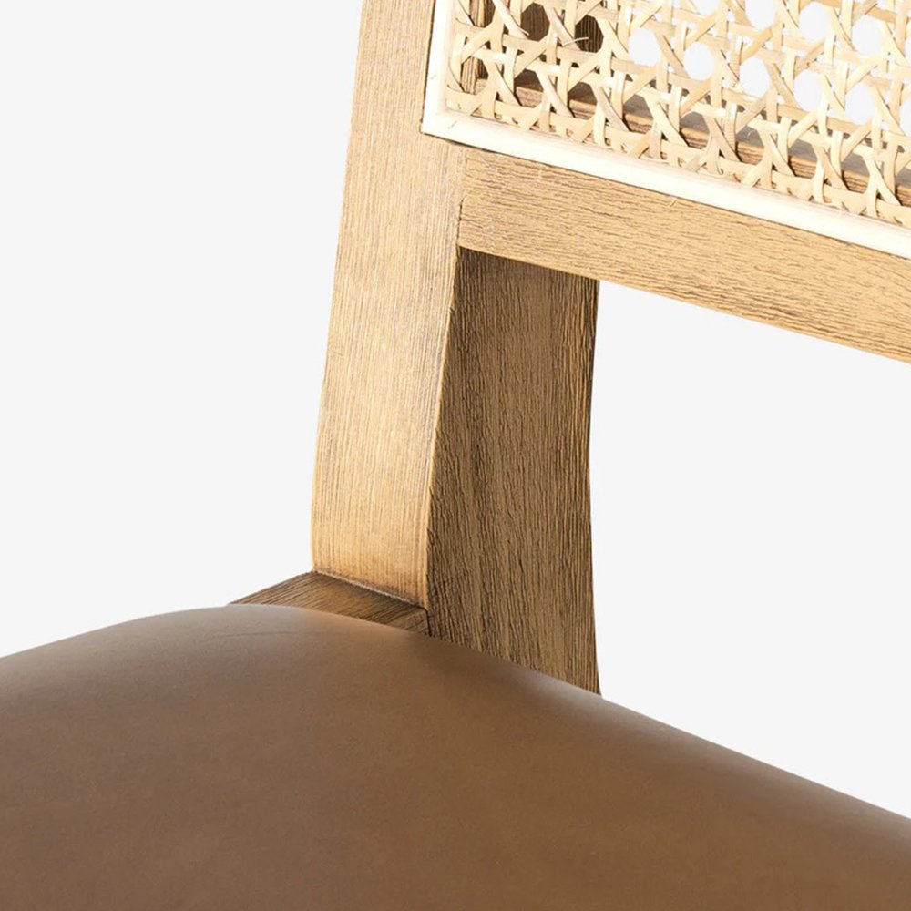 Designed with a solid wood frame, the Wildhaven Bar Chair plays with texture and shape. With sleek rectangular elements that hold the cane back and a rich faux leatherette cushion, the stool has an elevated yet approachable feel.