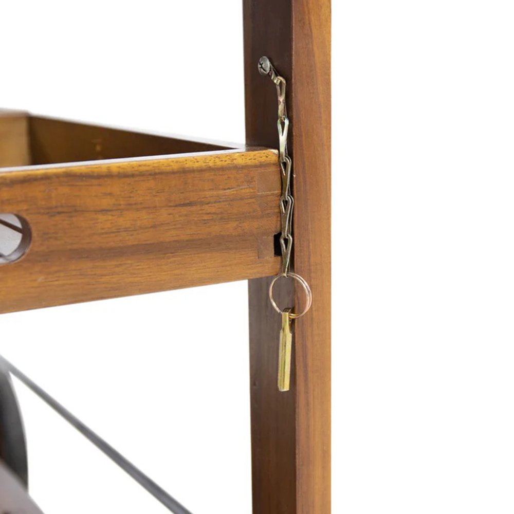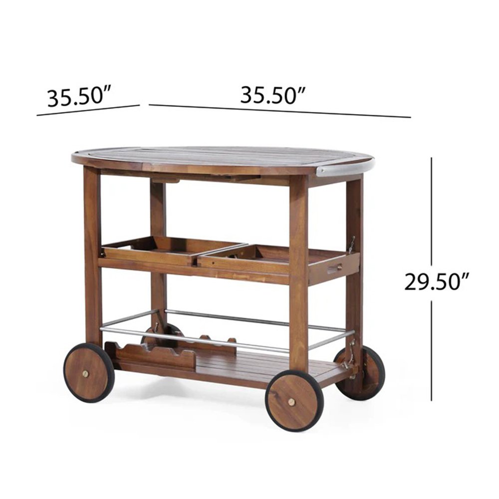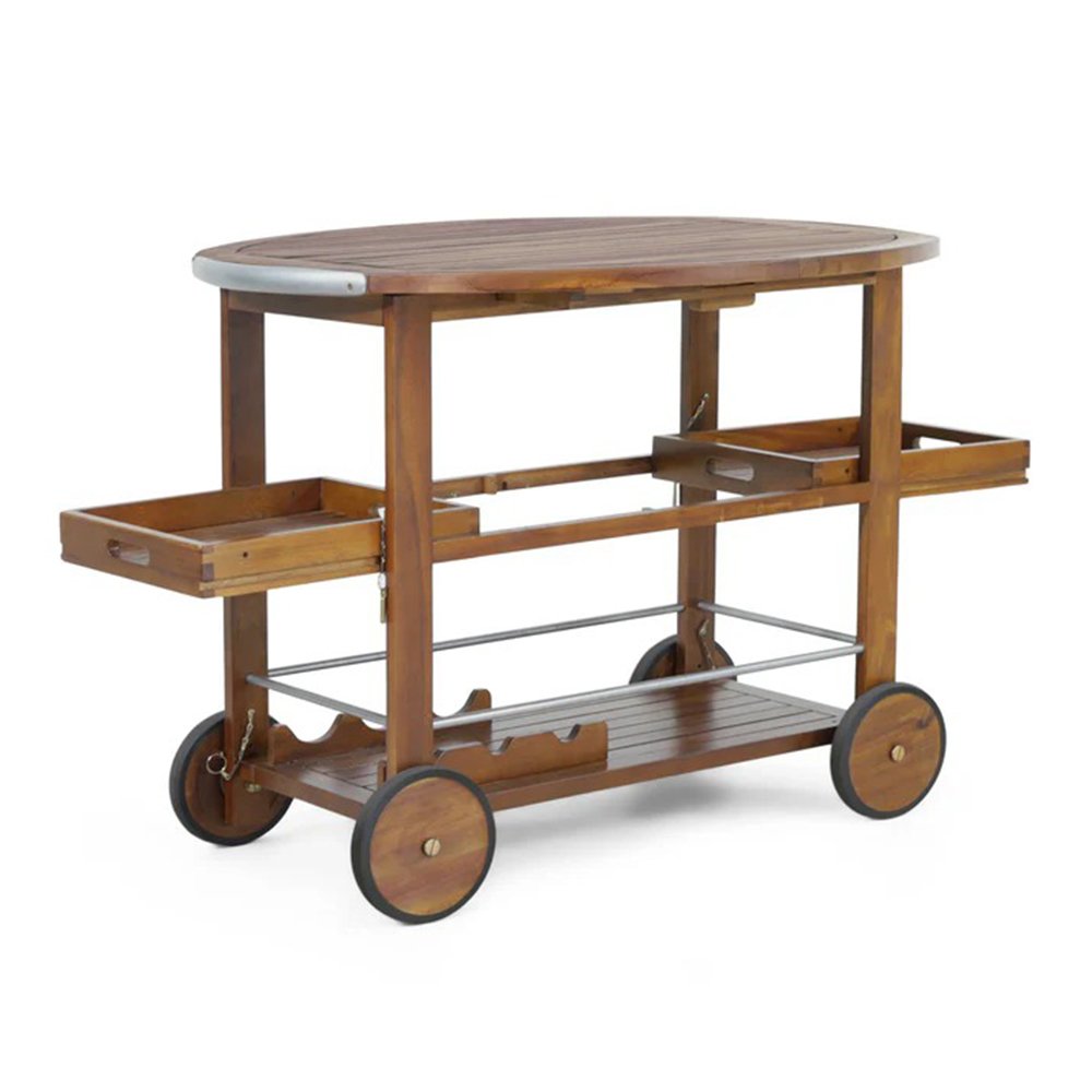 Use our classic bar cart to make your parties as fun, unique, and well-put-together as you are. Featuring rich and durable acacia wood construction, this cart adds a natural element to your home. A convenient drop leaf extension ensures ample space for all your barware and beverages, while three wine bottle holders and two removable trays add to the smart design. The piece is completed by aluminum accents and locking wheels. Host a beautiful soiree with help from our handy and lovely bar cart.