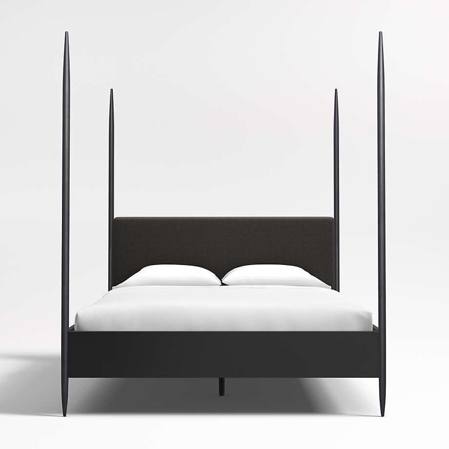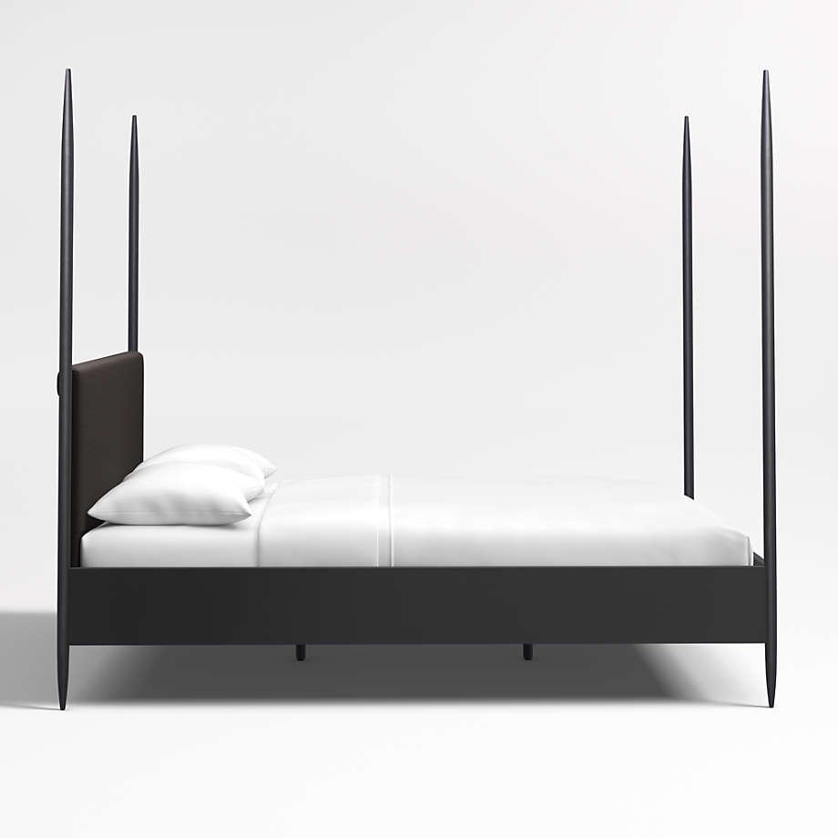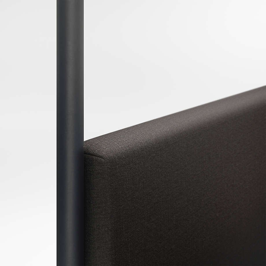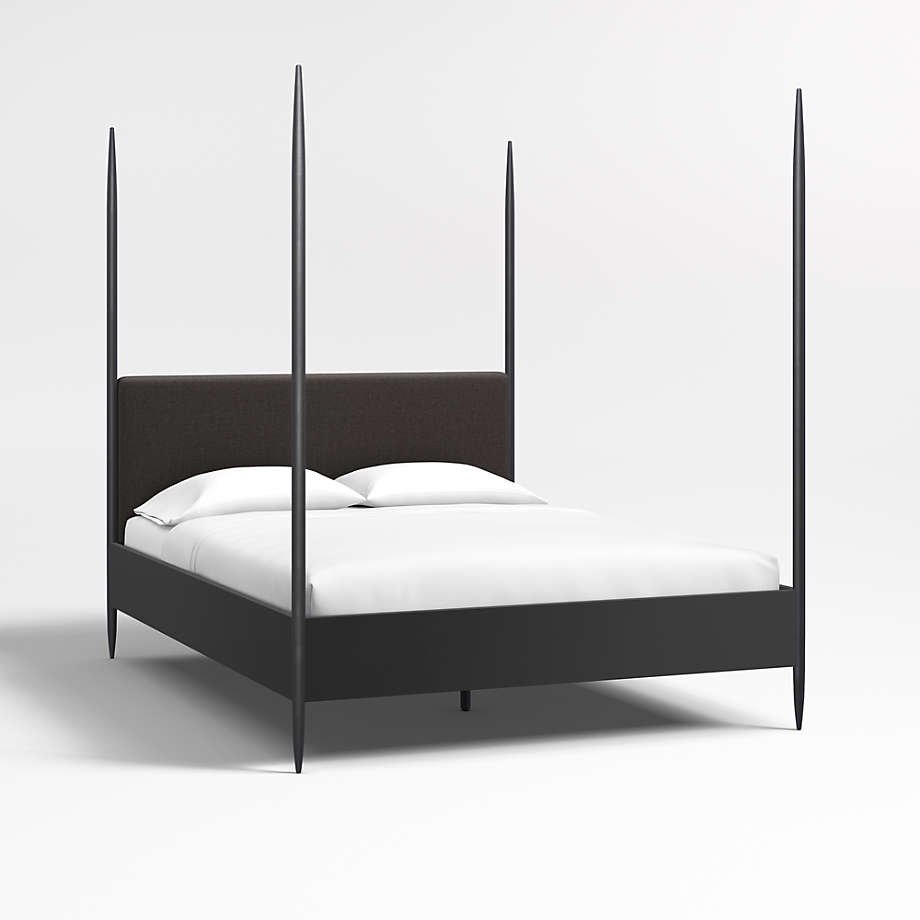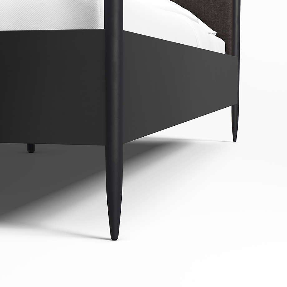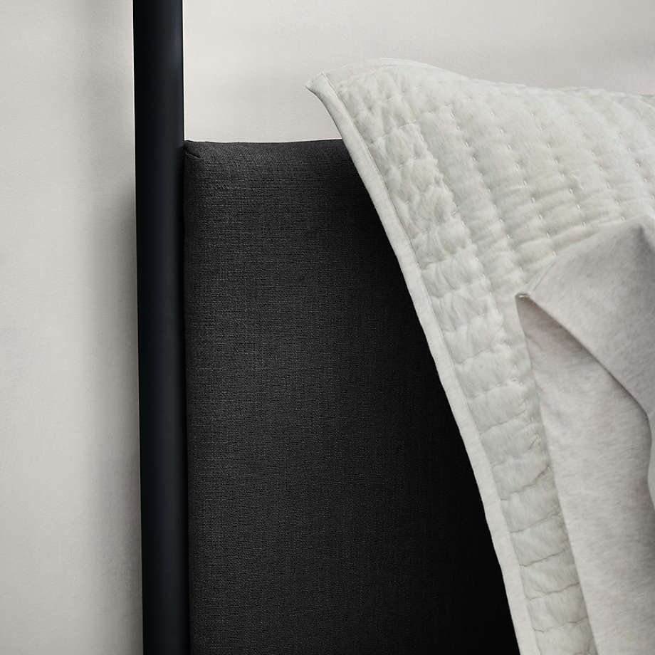 The classic poster bed goes full-out contemporary in our Yorkshire bed. Streamlined steel posts rise high and tapered, finished in black with a fine sand-like texture. The minimalist headboard is neatly wrapped in a black fabric with the nubby feel of linen. With its low platform and high-rise posts, our exclusive Yorkshire bed plays with proportions in a uniquely modern way.
