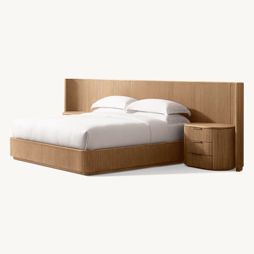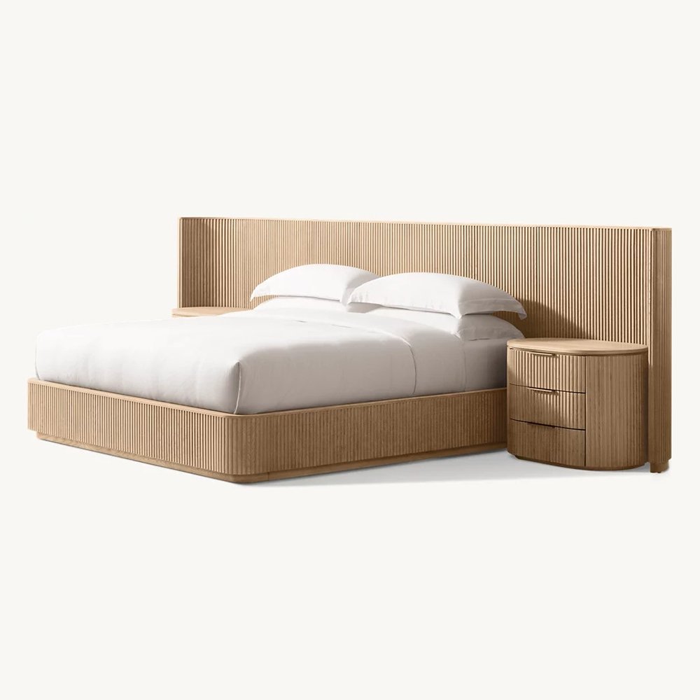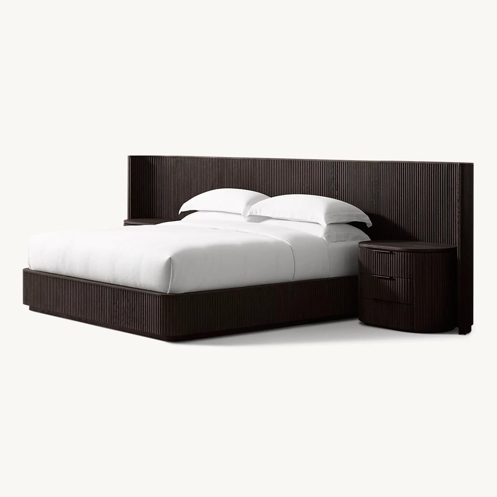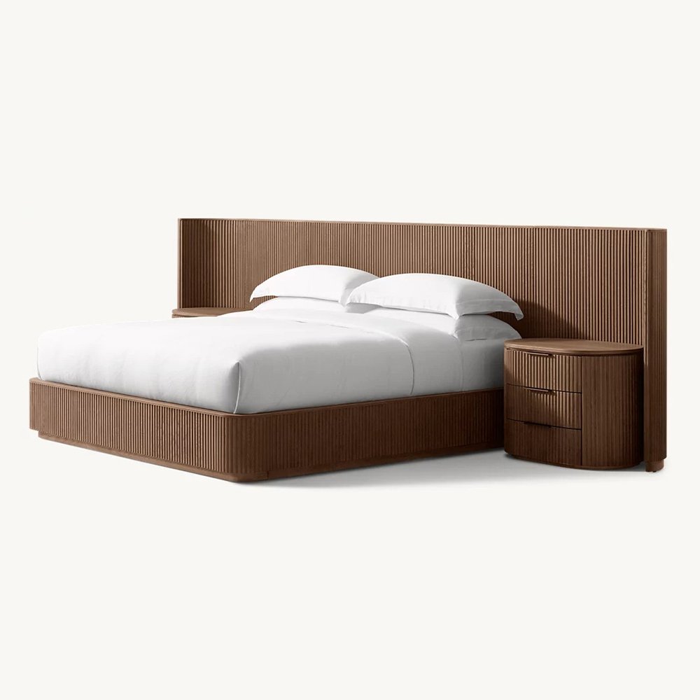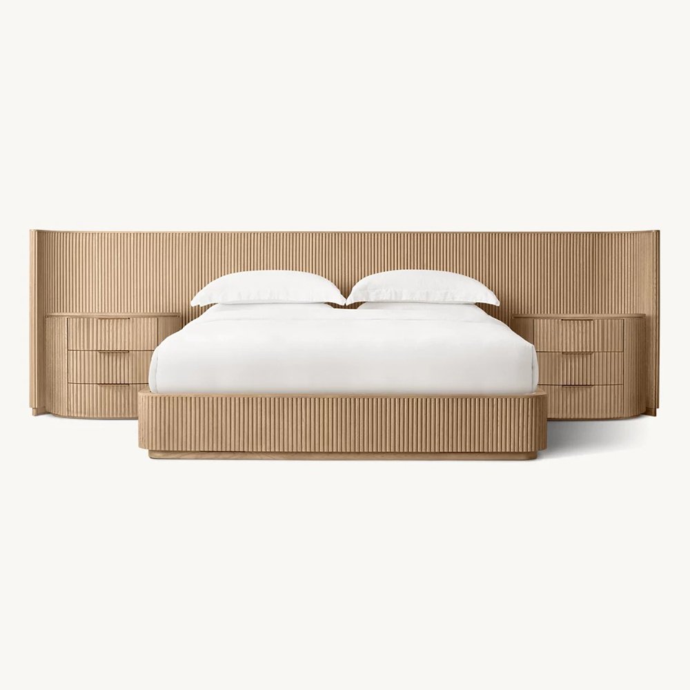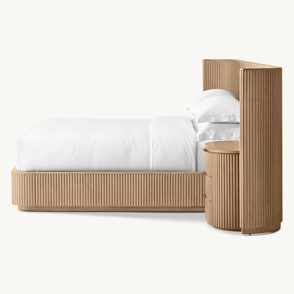 The bold shapes of our collection from Furndune recall the proportions and fluid curves of postmodernism, while vertical reeding lends a classical counterpoint. The geometric frames, crafted of solid wood, appear to float on recessed plinth bases, casting a crisp shadow line.