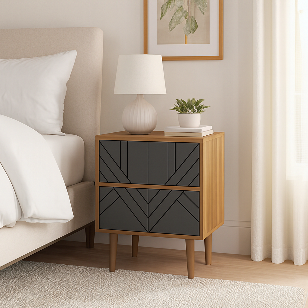 The Arden Bedside Table will be the envy of all who enter your home. This art deco-inspired bedside table is made modern with a pared-back design and grey and wood-look pairing. The geometric design gives this unit lasting appeal. With two spacious drawers for handy storage, this side table ensures you can keep rooms tidy and fresh. With space for your lamp, device, and book and drawers for everything else you’d prefer out of sight, this side table has everything you need for any member of the family.