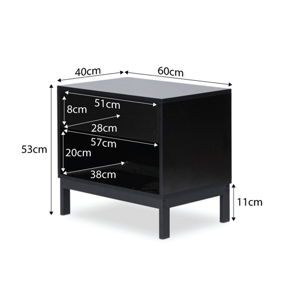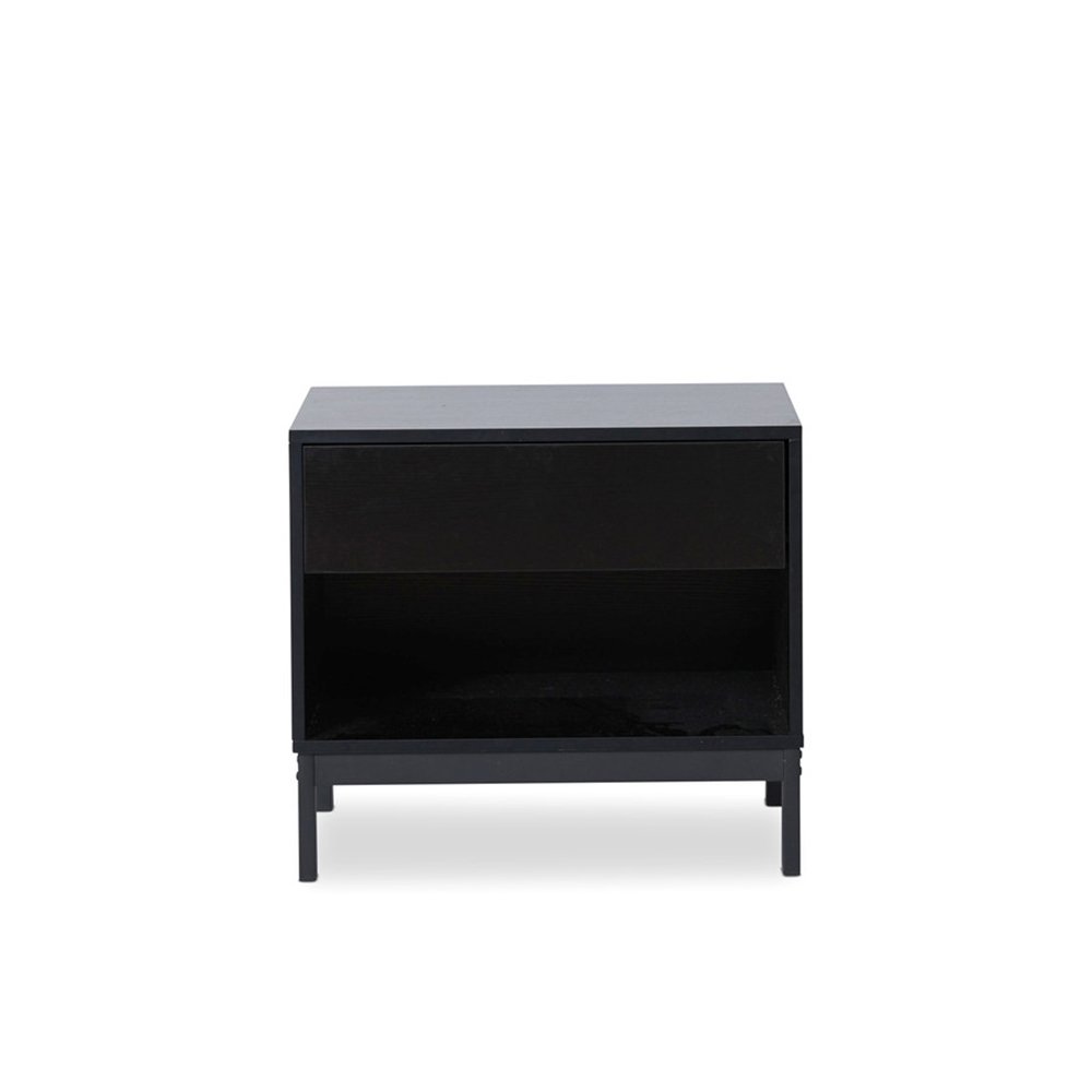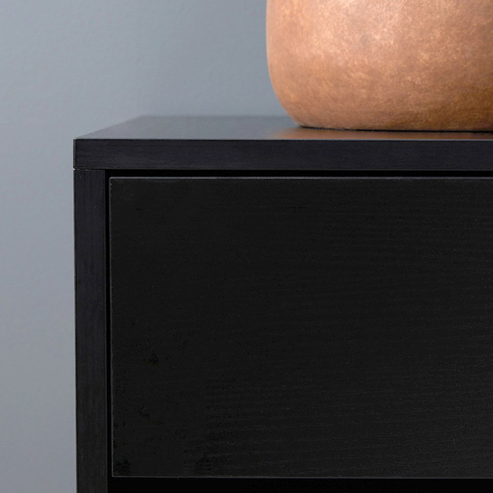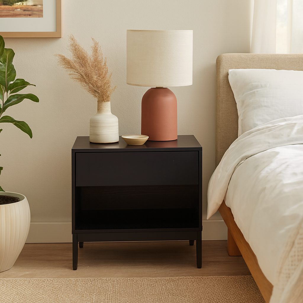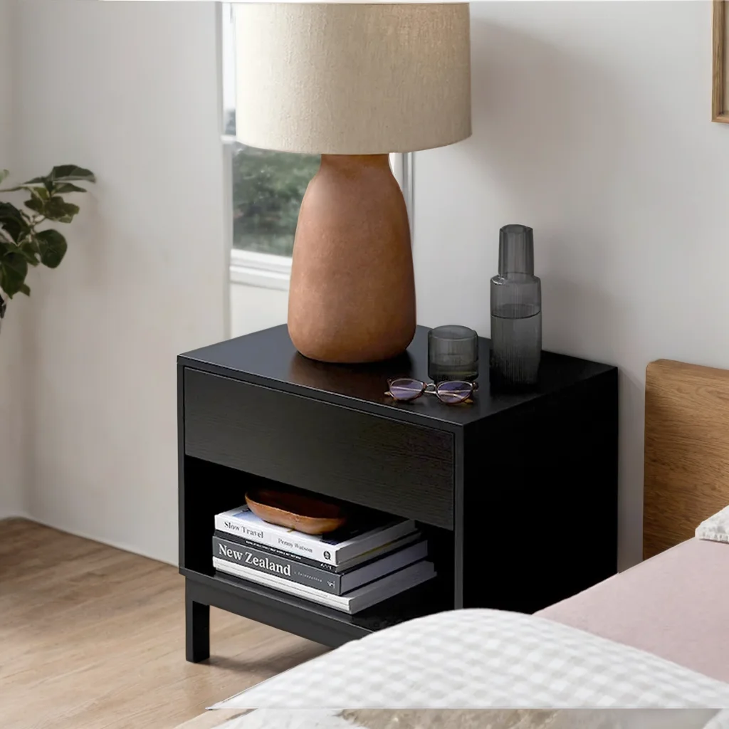 The Walden Bedside Table – Black adds a sophisticated, modern style to your bedroom. For a statement look in any bedroom, it has a sleek outline, woodgrain finish, and black colorway. This Australian-designed side table has enough room up top for a lamp and your charger and a spacious single drawer for the essentials you want hidden but handy.