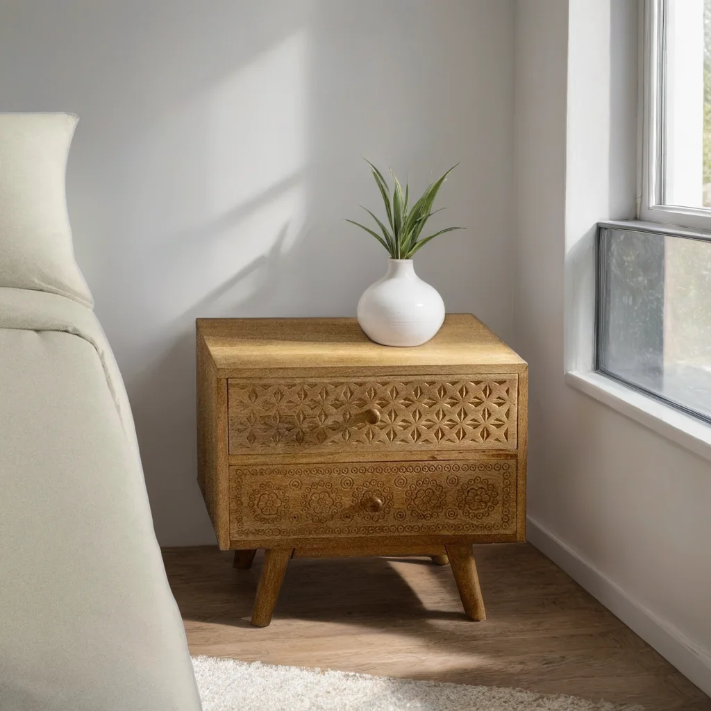 At FURNDUNE we love combining styles and incorporating different elements with personality into your home, and that is why we present our Mango Wood Bedside Table Langley Style an auxiliary furniture for your bedroom that blends rustic and Nordic style to create a unique composition. Made of mango wood, Atsana is robust and resistant but with a subtle character thanks to the naturalness of its colors and the geometric shapes of its hand-carved details that give it a very exclusive touch. It has two drawers that will allow you to store what you need so it will be a versatile and functional element for your home. Due to its artisan manufacture, you can see unique marks and irregularities in each product.