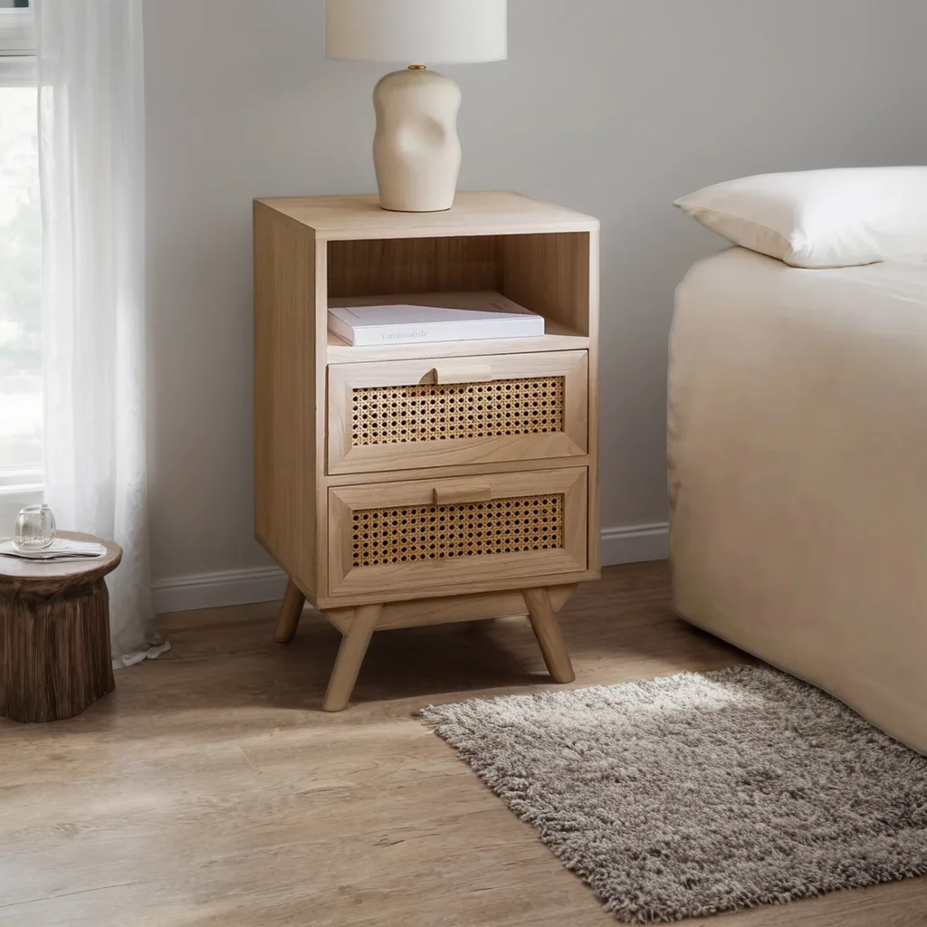 Our Ralik Wood Bedside Table with Drawers is perfect for any room in your home. Designed following vintage style trends, it combines the robustness and resistance of natural wood with cane decoration. A storage cabinet with two drawers and a shelf that will allow you to display and organize everything you need at any time, keep your home tidy and clean without losing the elegance and sophistication you deserve. Thanks to its functionality, you will not resist the temptation to place it where you need it most, not only as a wonderful nightstand but also as a side table or storage unit.