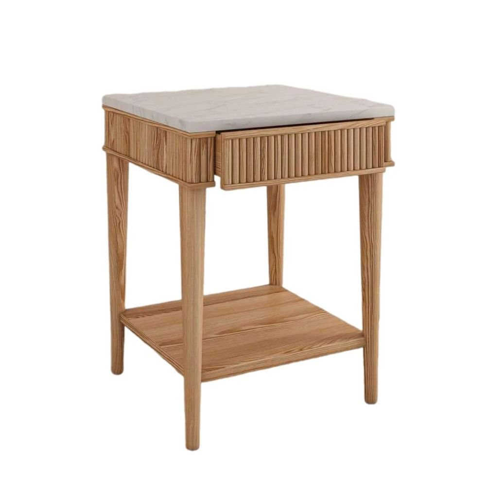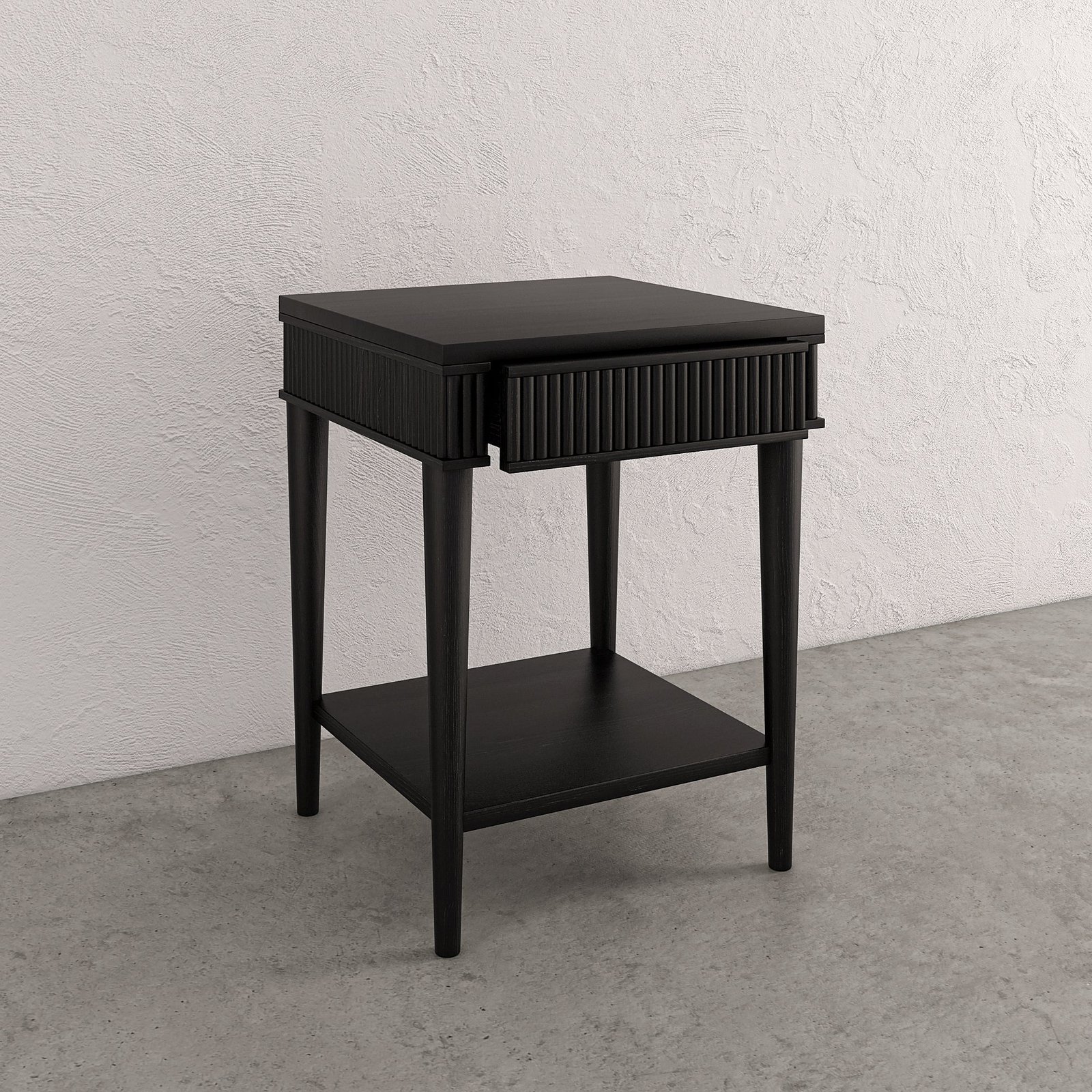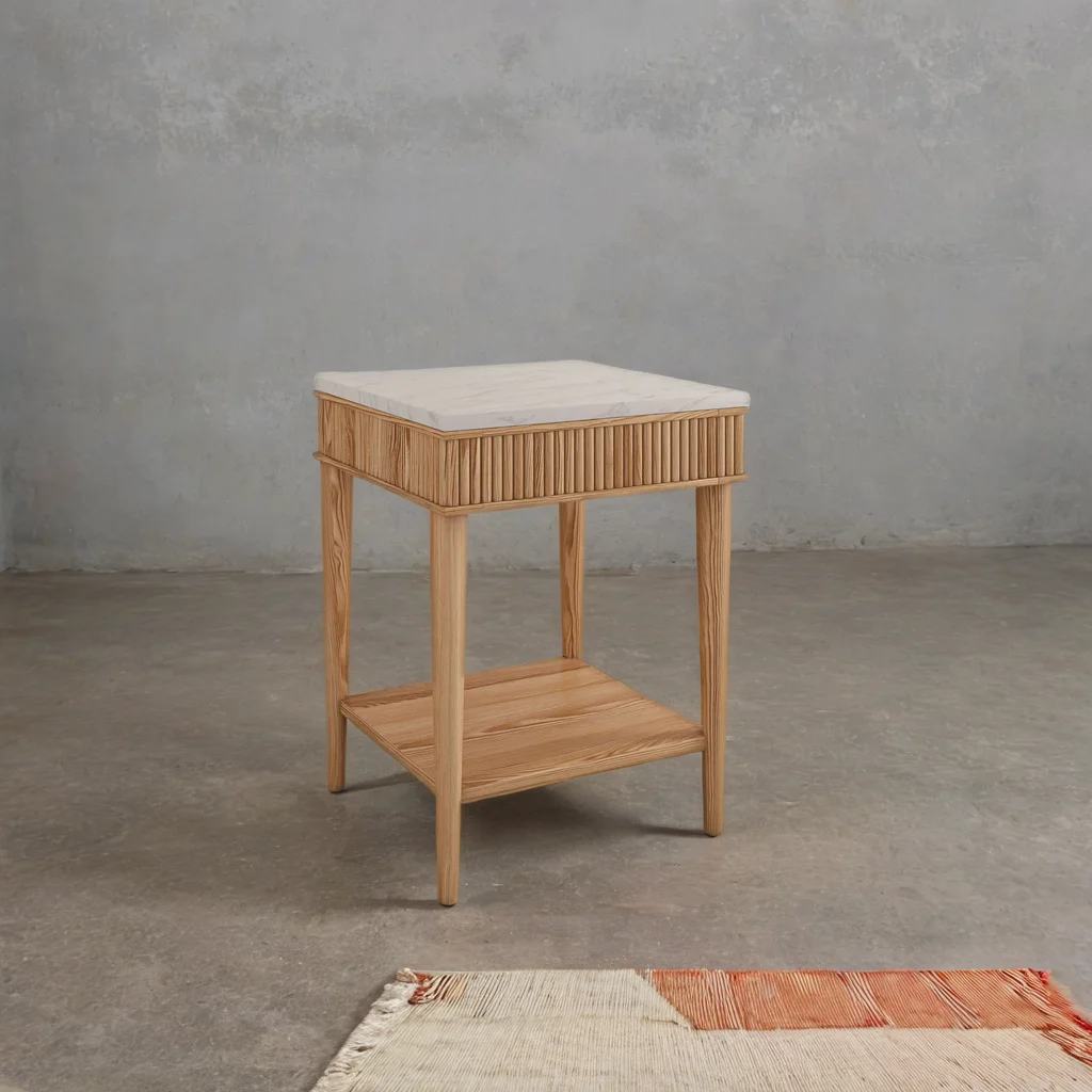 The small nightstand table features a delicate reeded detail and is available with either a solid white marble top or a solid black timber top. A practical and versatile side table that would fit into any bedroom or living space. The design provides a hint of style and minimalism. The design combines 2 strong materials which have been given a delicate form through the craftsmanship of carefully carving details into the piece.