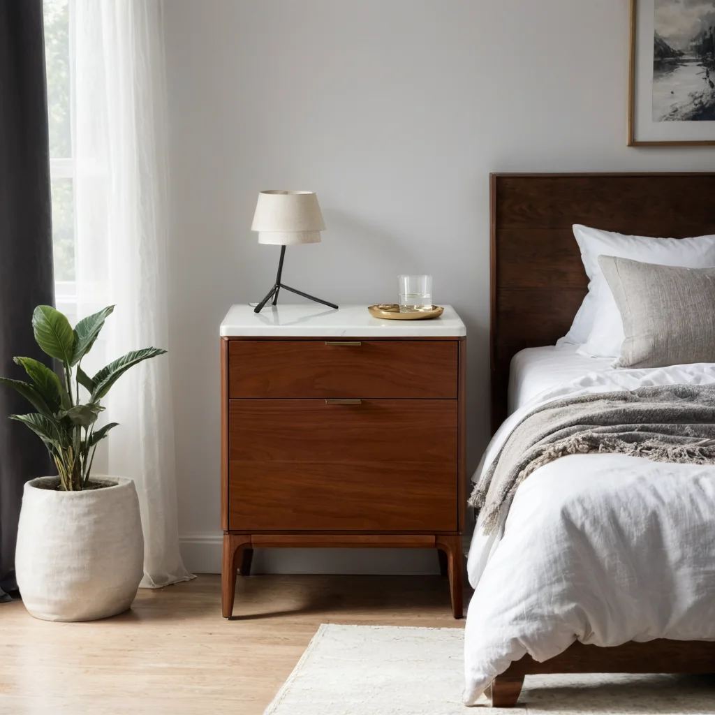 The nightstand is usually made from high-quality wood, such as solid wood, and features a minimalist design with clean lines and a smooth finish. It may have one or two drawers for storage, which can be used to store items such as personal belongings, reading glasses, or medications.