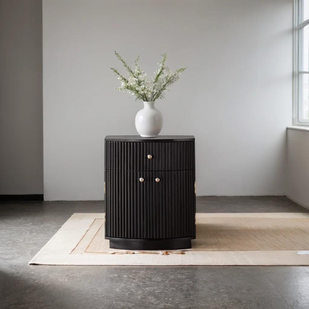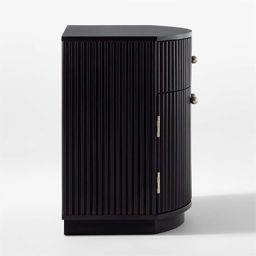 Black-stained solid wood nightstand supports a unique, curved silhouette and configuration: one drawer and two doors concealing a shelf inside for extra storage. We love the on-trend channeled detailing and satin-finish mild steel knobs.
