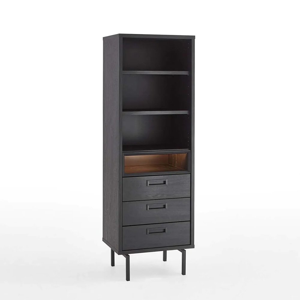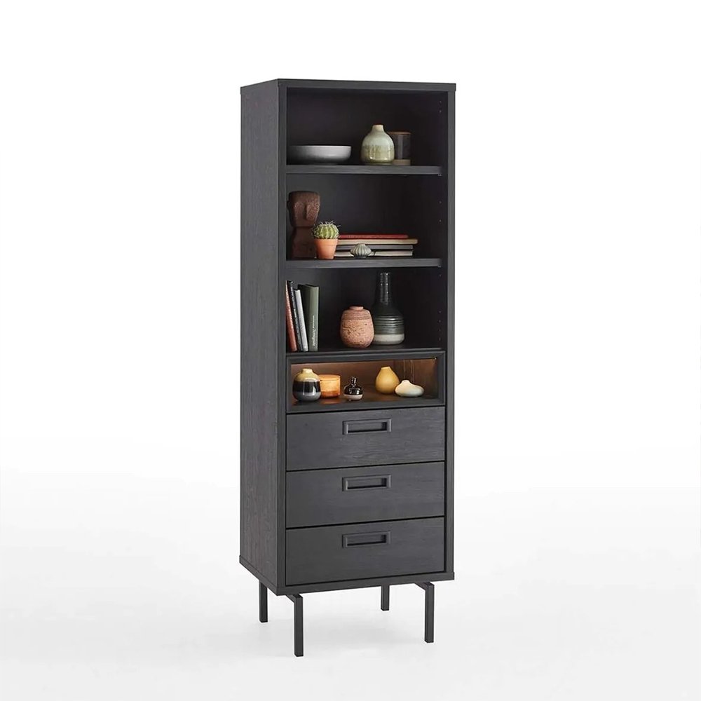 The Granite Ridge Bookshelf with metal is made of high-pressure laminate and comes in a black, mango wood color. The furniture stands on a metal base and has beautiful, incorporated handles that are also black. The furniture with doors from equipped with a luxurious soft-close system. The lighting in the open compartment is not included as standard and can be ordered separately if desired. This stylish living series is a guaranteed asset to your living room and will create a warm atmosphere in your home.