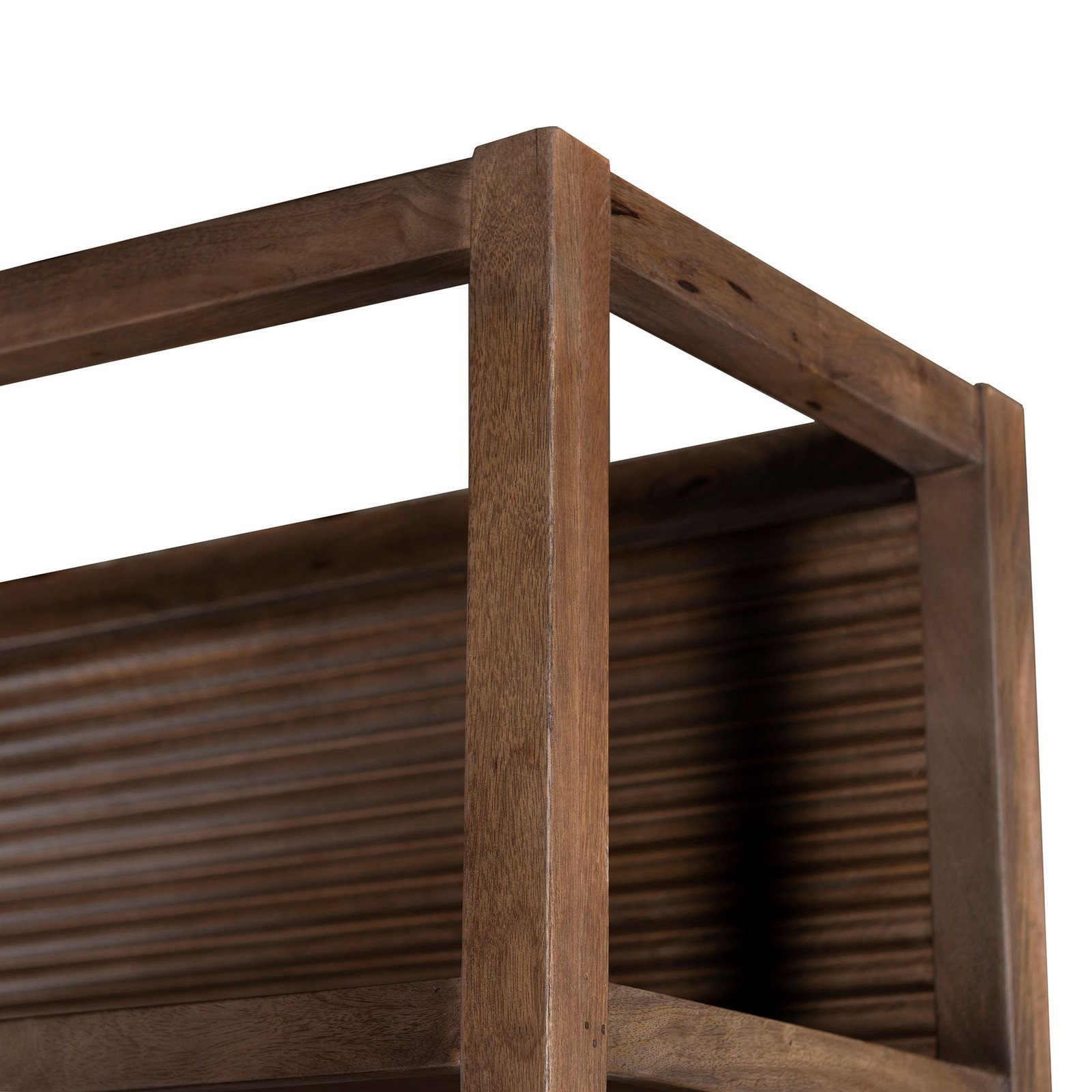 Its a relaxed, casual vibe and a washed finish. The fluted back adds intrigue. Five shelves display books, knickknacks, and more. Made from kiln-dried wood for added durability.