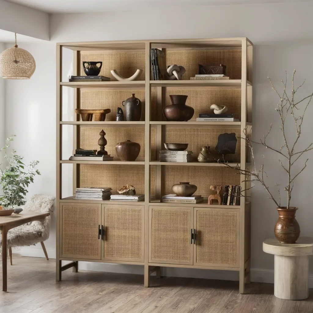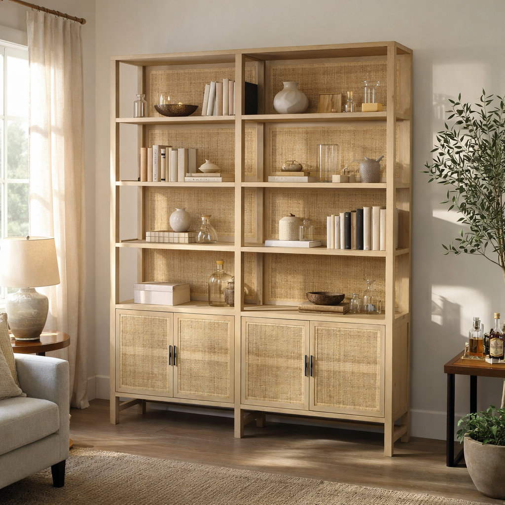 Northspire Caprice Wide Bookshelf talk about texture. Natural-washed mango forms extra-roomy open shelving, with rear paneling plus door fronts of natural woven cane for a modern monochromatic look and a fashion-forward feel.