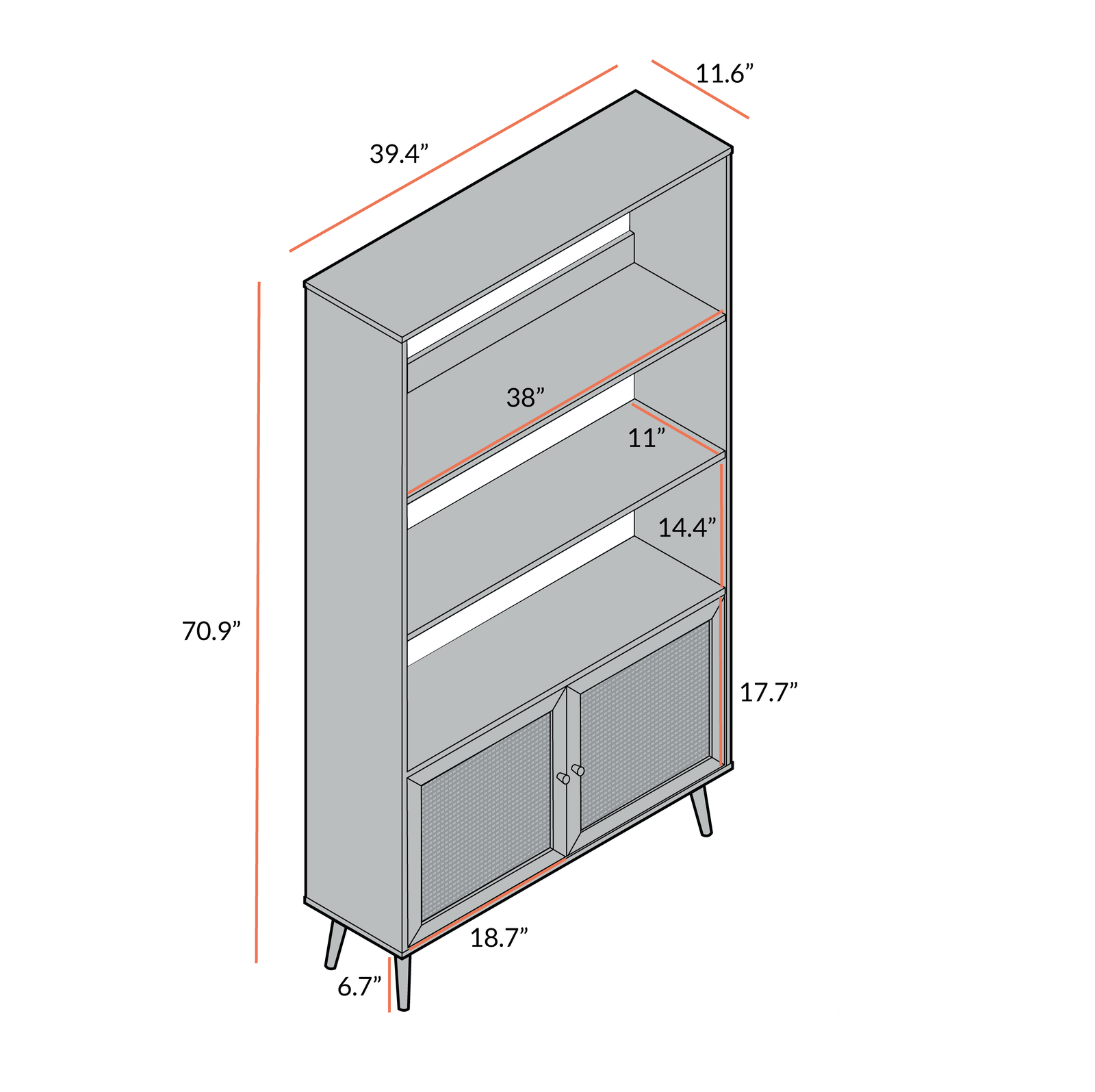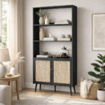 The Frances Woven Rattan Bookcase also comes with a double-door closed section with cabinet space, which is perfect for tucking away any of your items. Hand-woven natural rattan inserts on the doors coordinate with solid wood door handles. Overall Dimensions: W 39.4 x D 11.6 x H 70.9 in. Item comes flat-packed, assembly is required.
