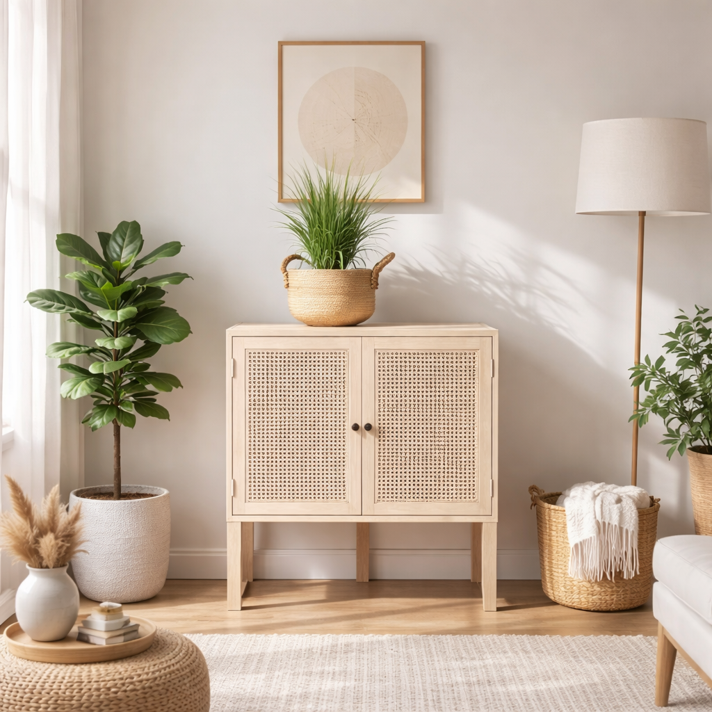 Introducing our sleek and stylish 2 Door Lindenfield Cabinet, perfect for those who want to maximize storage space without sacrificing style. Crafted from eco-friendly rattan and sustainable kiln-dried solid wood, this cabinet is not only functional but also environmentally conscious. Use it as a shoe cabinet, to store extra dinnerware, or simply to keep your home clutter-free.