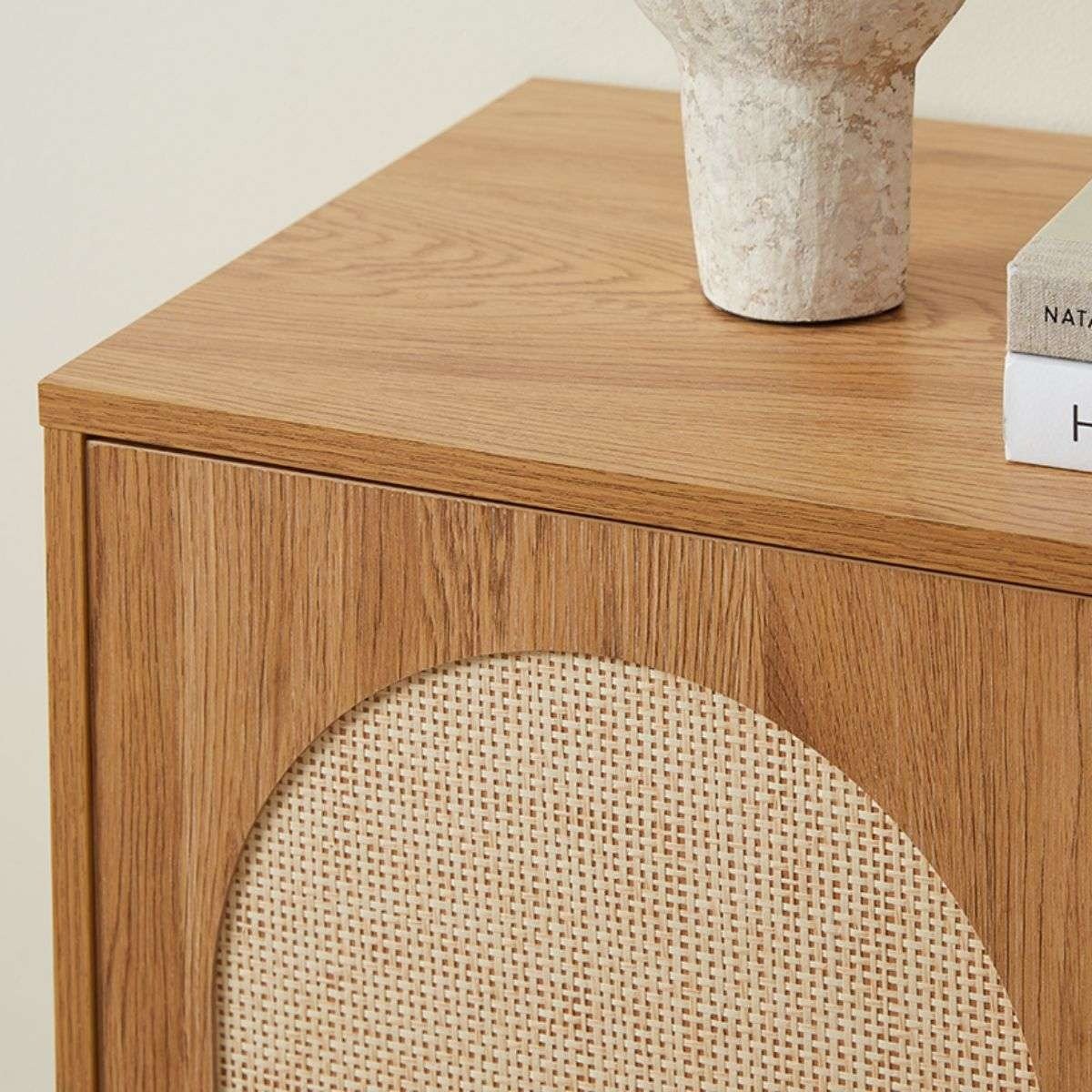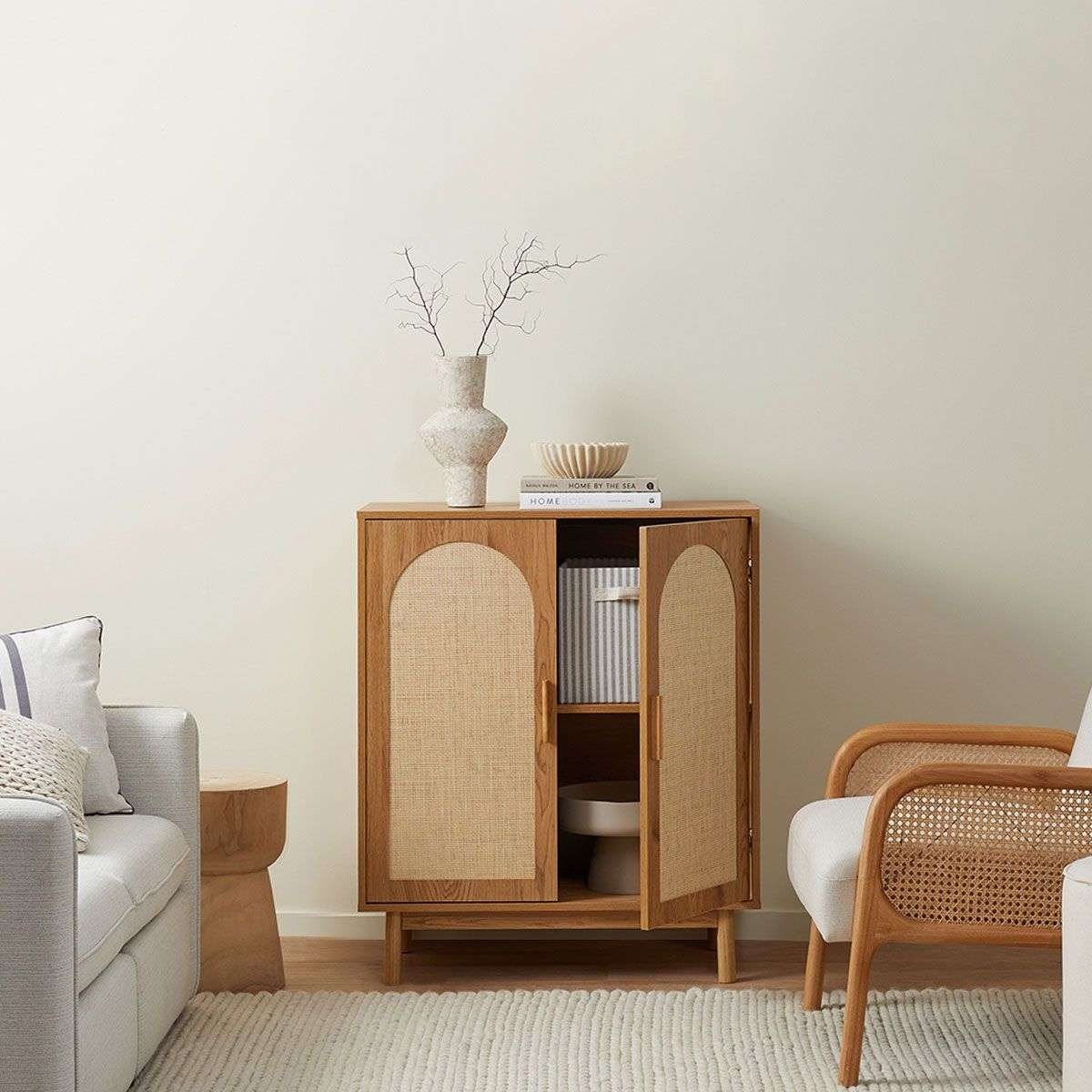 Versatile and stylish, the Pebblefield Two-Door Cabinet is a storage solution for any room in your home. Featuring a warm wood-look grain finish and arched rattan panels on the cupboard doors, it adds on-trend design to any space.