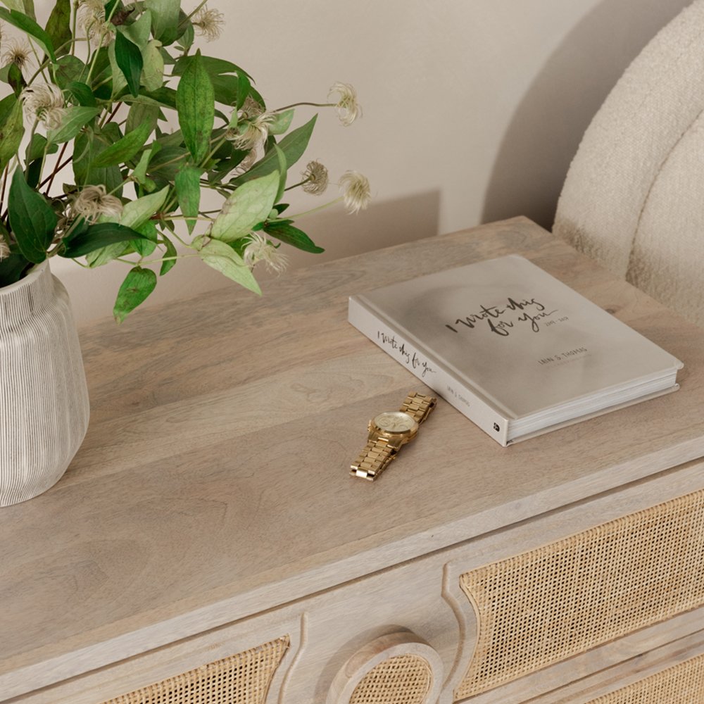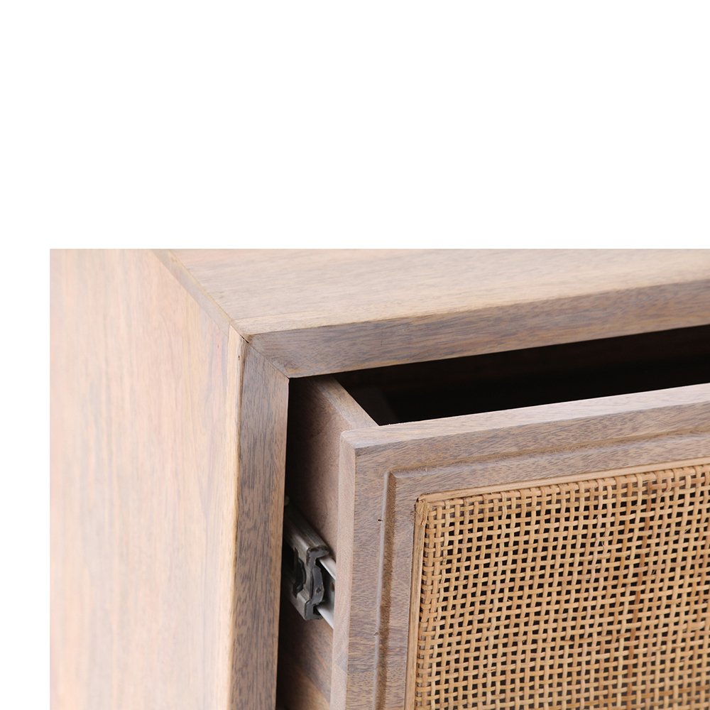 A Scandi-style dresser in a refined combination of light-colored, solid mango wood and natural woven cane detailing with three spacious drawers fixed with side-mounted glides, and sturdy legs for lasting durability.