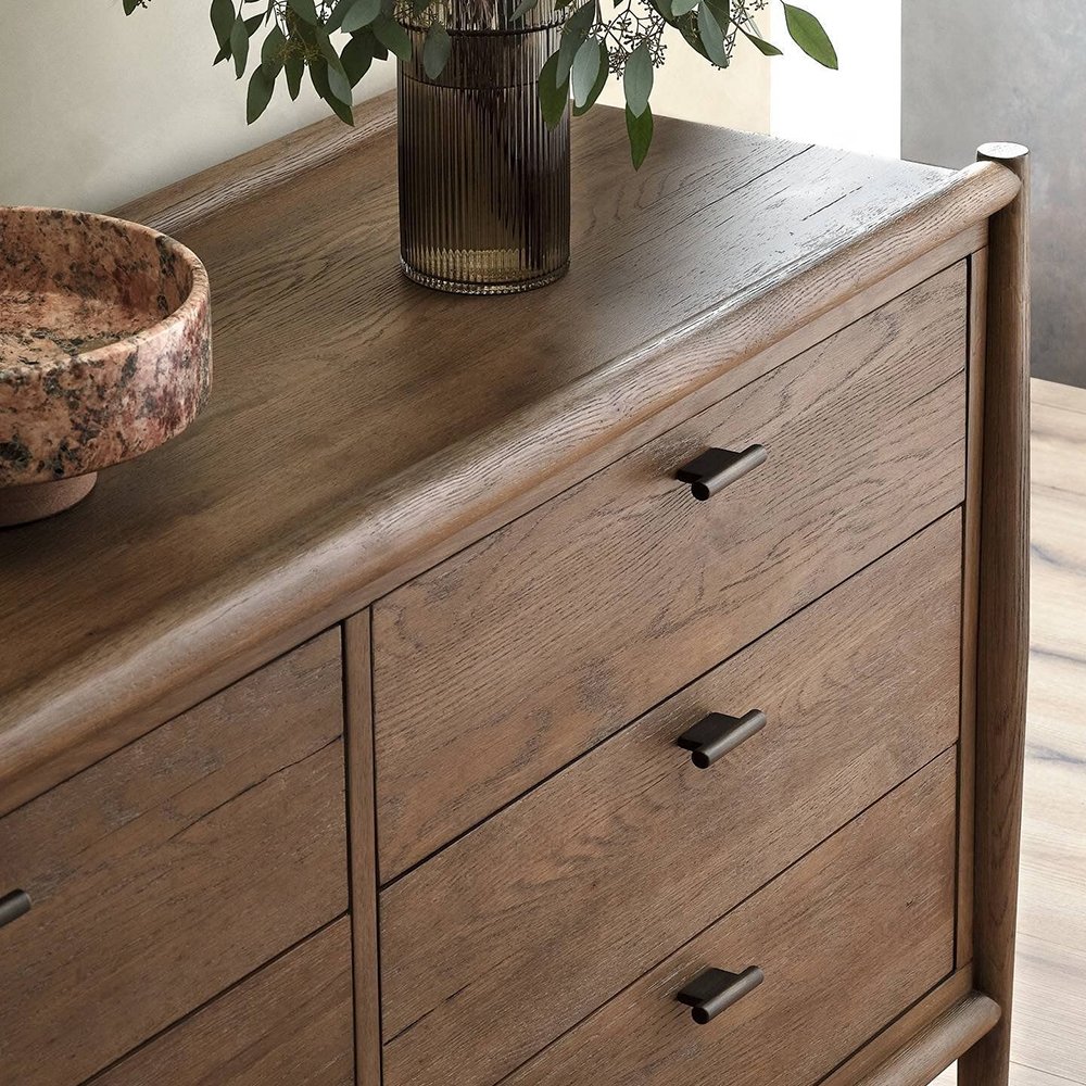 The traditional spindle structure brought to modern speed. Made from weathered solid wood with a light, rustic finish, six spacious drawers bring generous storage space to the bedroom. Simple cylindrical hardware is finished in an aged bronze.