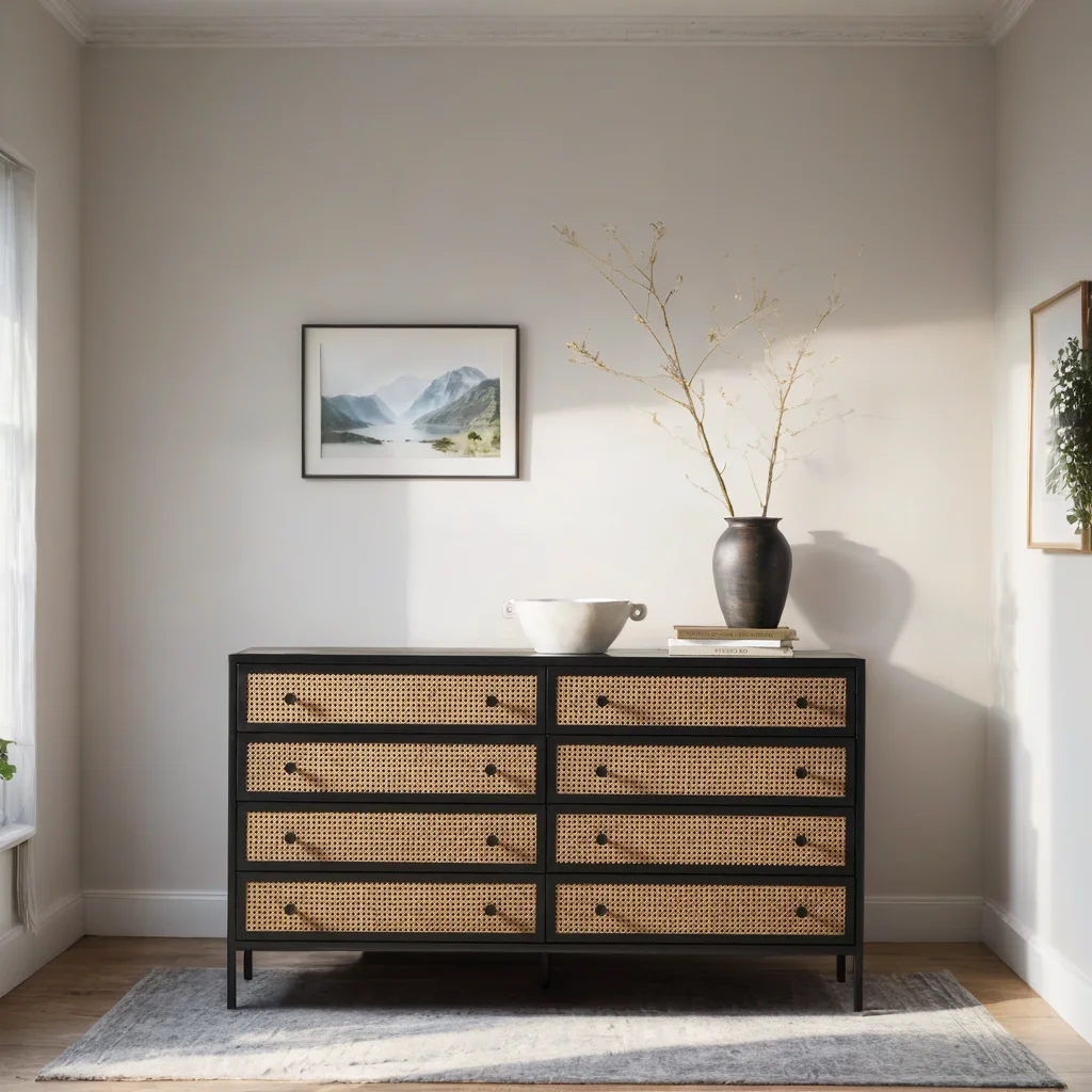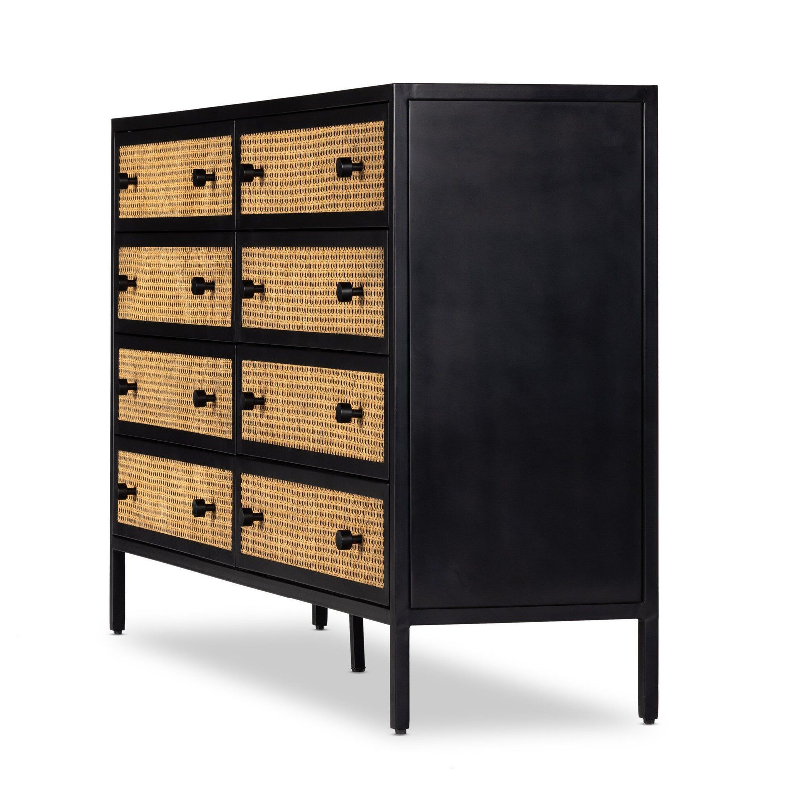 Midcentury materials with an industrial twist. Black-finished iron forms a contrasting frame for inset drawer panels of natural cane.