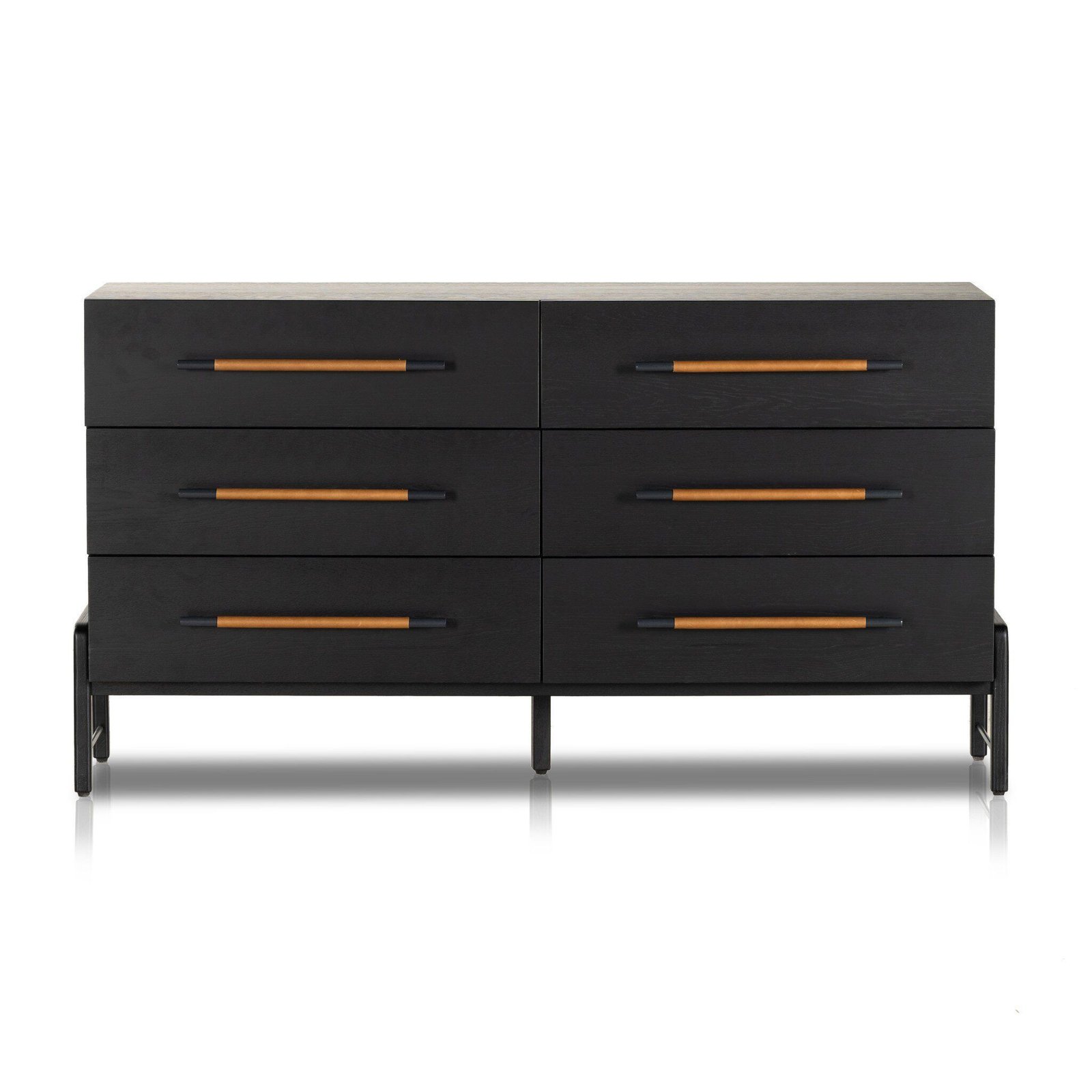 Ebony-finished solid wood forms a clean silhouette for six spacious drawers with iron hardware wrapped in tan top-grain