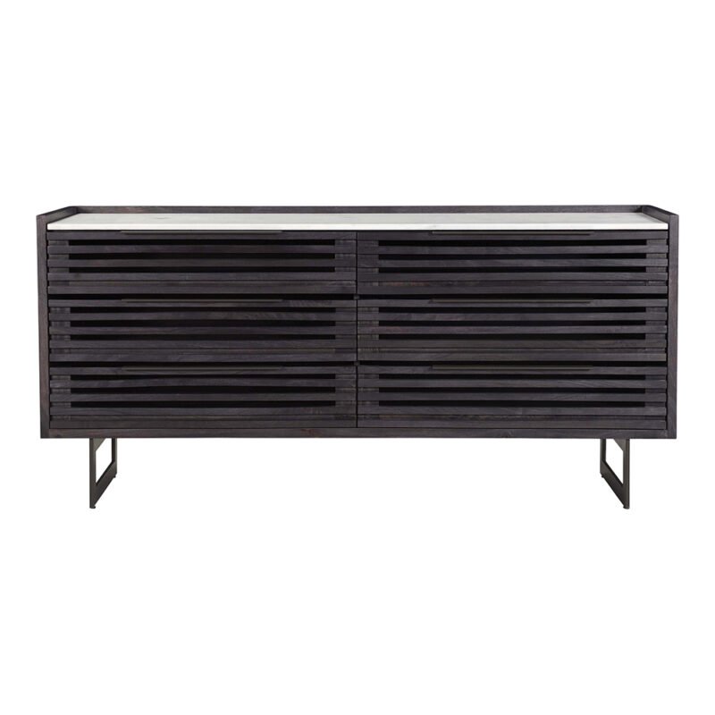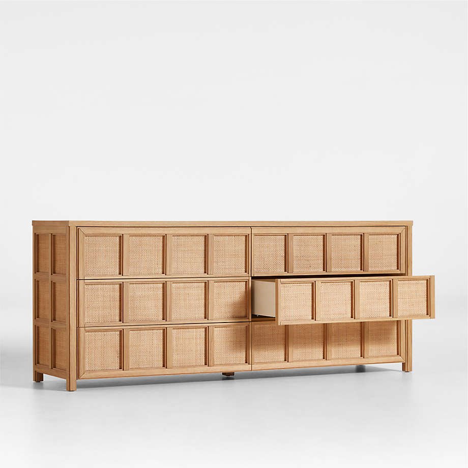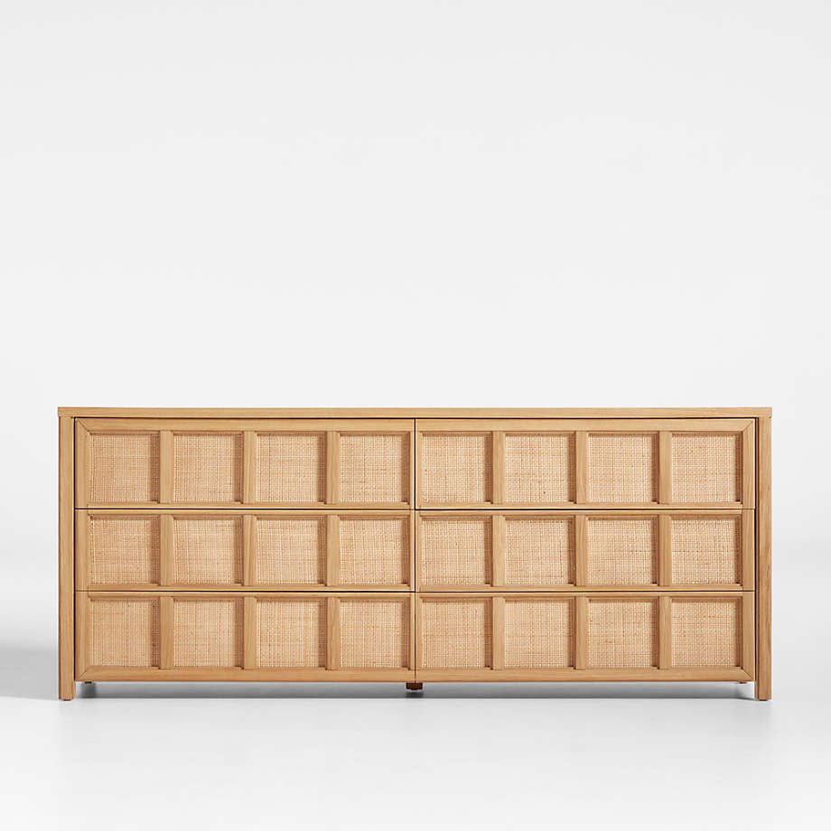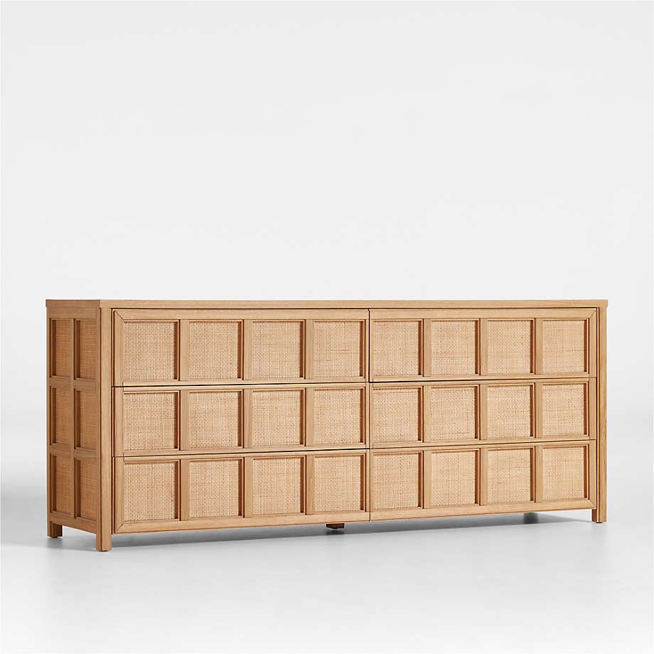 Simple symmetry and airy rattan caning keep our Stonebridge dresser looking fresh and timeless. For a view of fine craftsmanship from several angles, the dresser is wrapped from front to side with a grid pattern made of woven rattan framed in solid wood. Hidden finger grooves on the six drawers maintain a seamless facade while providing access to storage space. A natural oak finish ties it all together, complementing the natural hue of the rattan detailing.