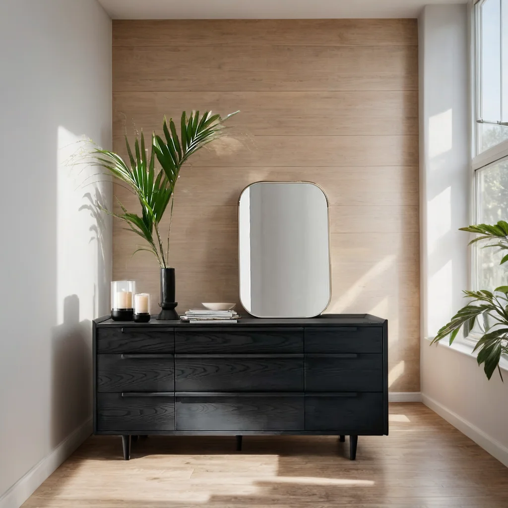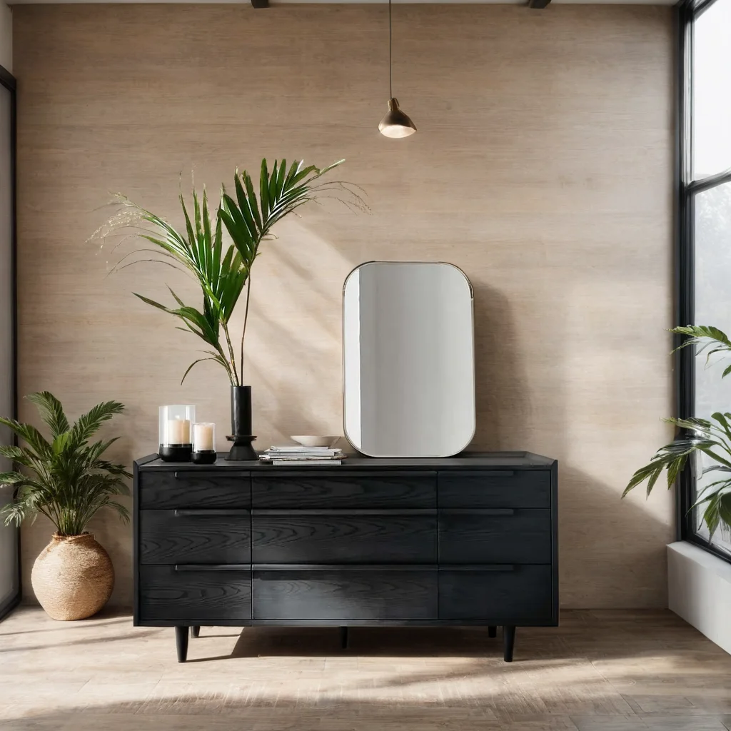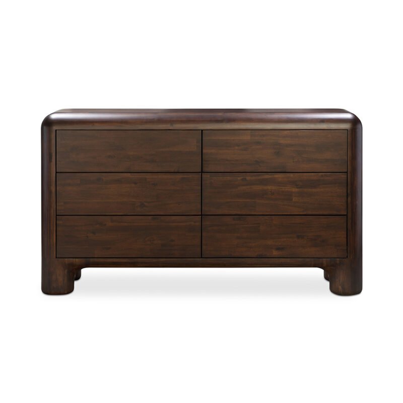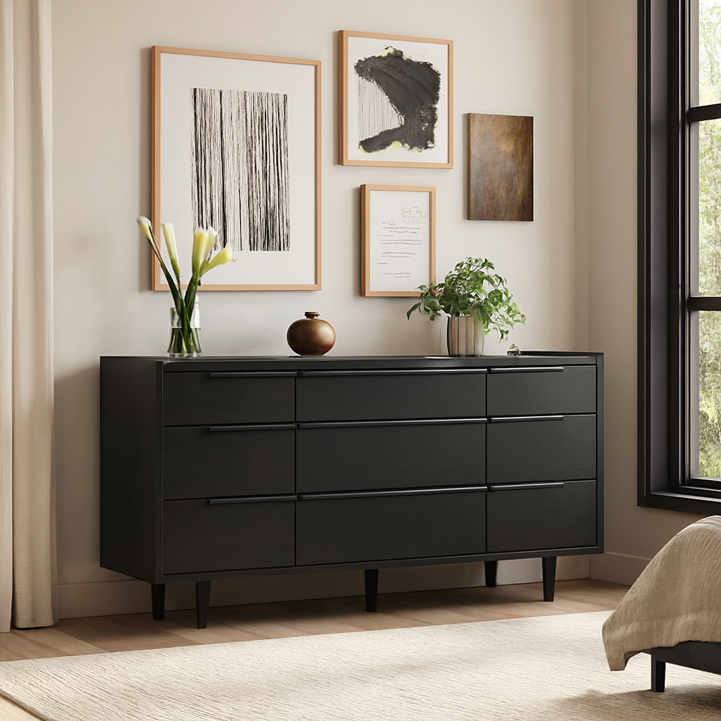 The horizontal dresser presents a continuous front with nine drawers of varying sizes. Designed by Furndune.
