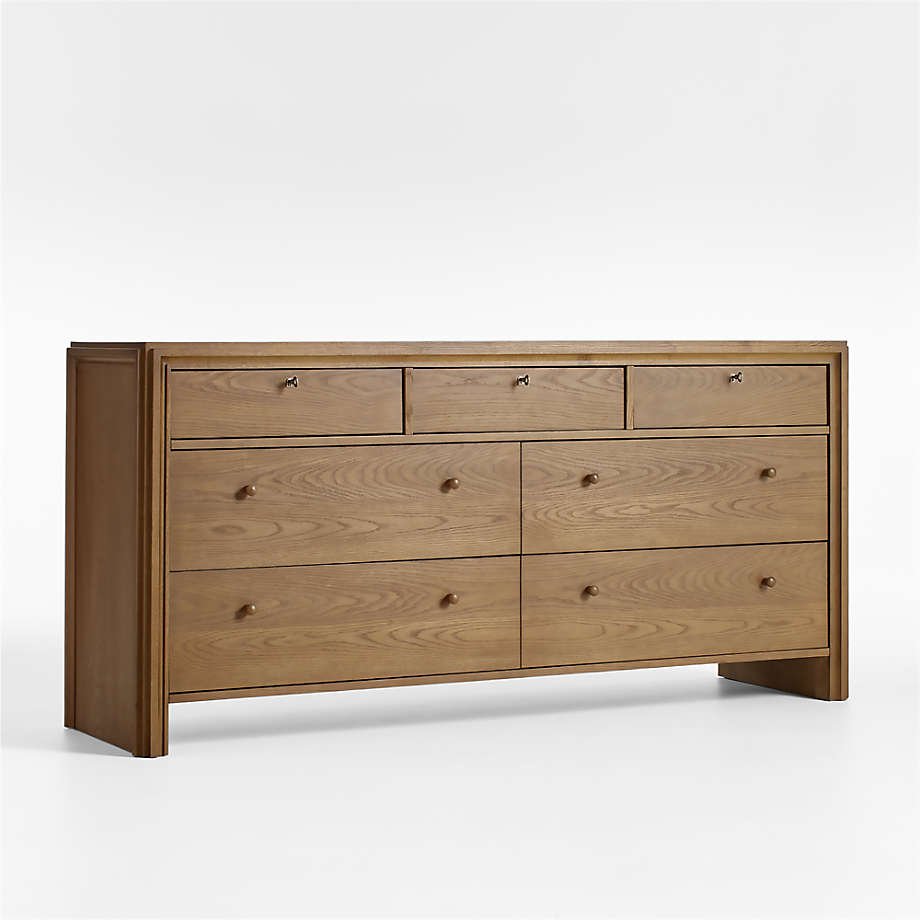 Keep your bedroom organized and put together with our Wickham solid wood dresser. Generously sized with four large and three small drawers, the dresser showcases the cathedral graining of solid wood in a timeless design. A pared-down take on traditional molding frames the waterfall profile in clean lines, while decorative key and escutcheon pulls on the top three drawers add a designer touch.