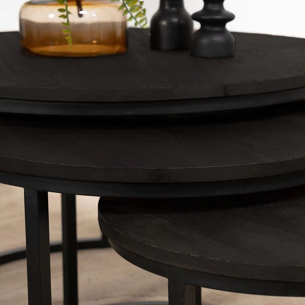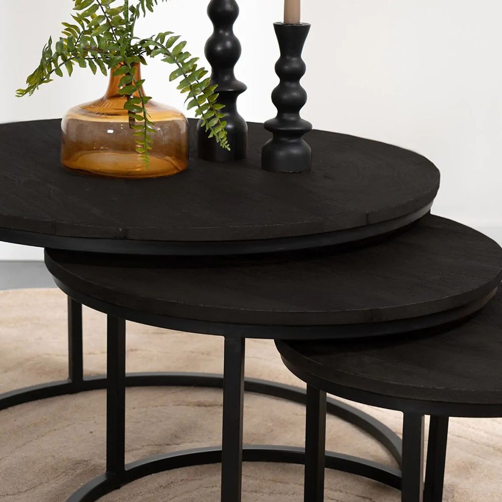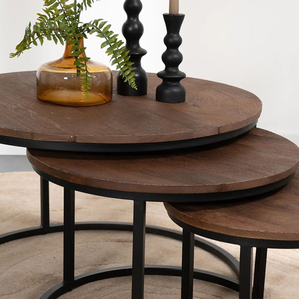This cool round coffee table set consists of 3 round tables made of mango wood and a black metal base. Slide them under each other to save space and just as easily slide them apart again for a playful effect. Round coffee tables are available in two colors: brown & black.