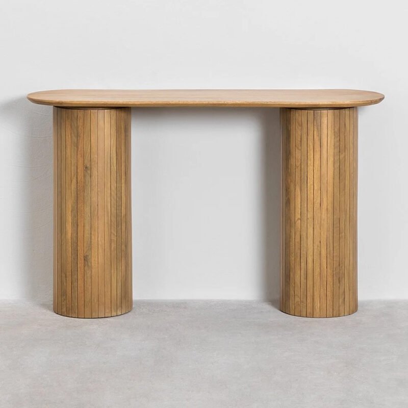 A solid wood Fernleigh console table is a piece of furniture designed to be placed against a wall, typically in a hallway, entryway, or living room. It serves both functional and decorative purposes, offering a surface for displaying items such as vases, picture frames, or lamps, while also providing storage space with drawers or shelves.