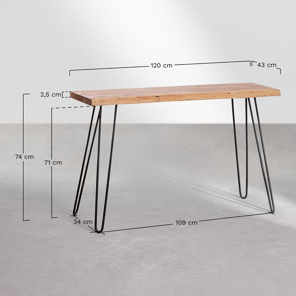 The Thornbrook solid wood Console Table is a piece of furniture that has a robust top that contrasts perfectly with the fine lines of its legs. The top finished in solid wood rests on fine metal legs that form a delicate layout. With an industrial style, it will be the perfect console for different rooms in your home. Pek is a table that you can place in different rooms such as your living room or hall. This beautiful console will be the protagonist of your home.