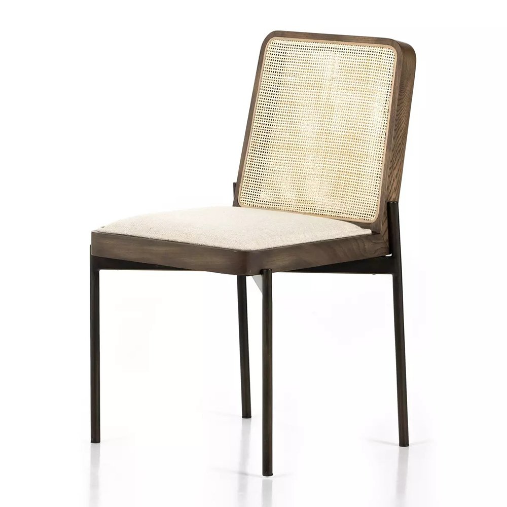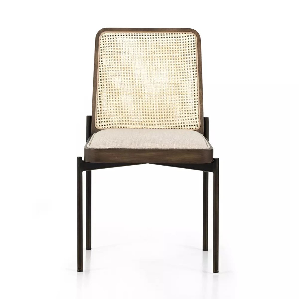 Mixed materials, Solid Mango Wood, natural cane, high-performance fabric, and bronzed iron fuse for a simple look with major impact.
