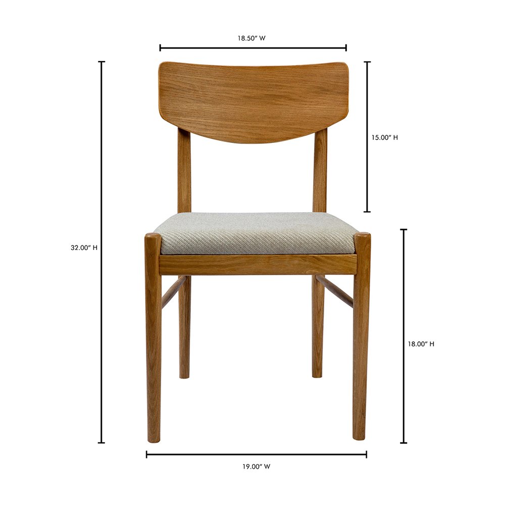 The Medford dining chair features a comfortable curved backrest, while the seat itself is made with a high-resiliency foam wrapped in textured polyester that adds tactility. Beautiful joinery and a natural Solid wood frame round out the piece.