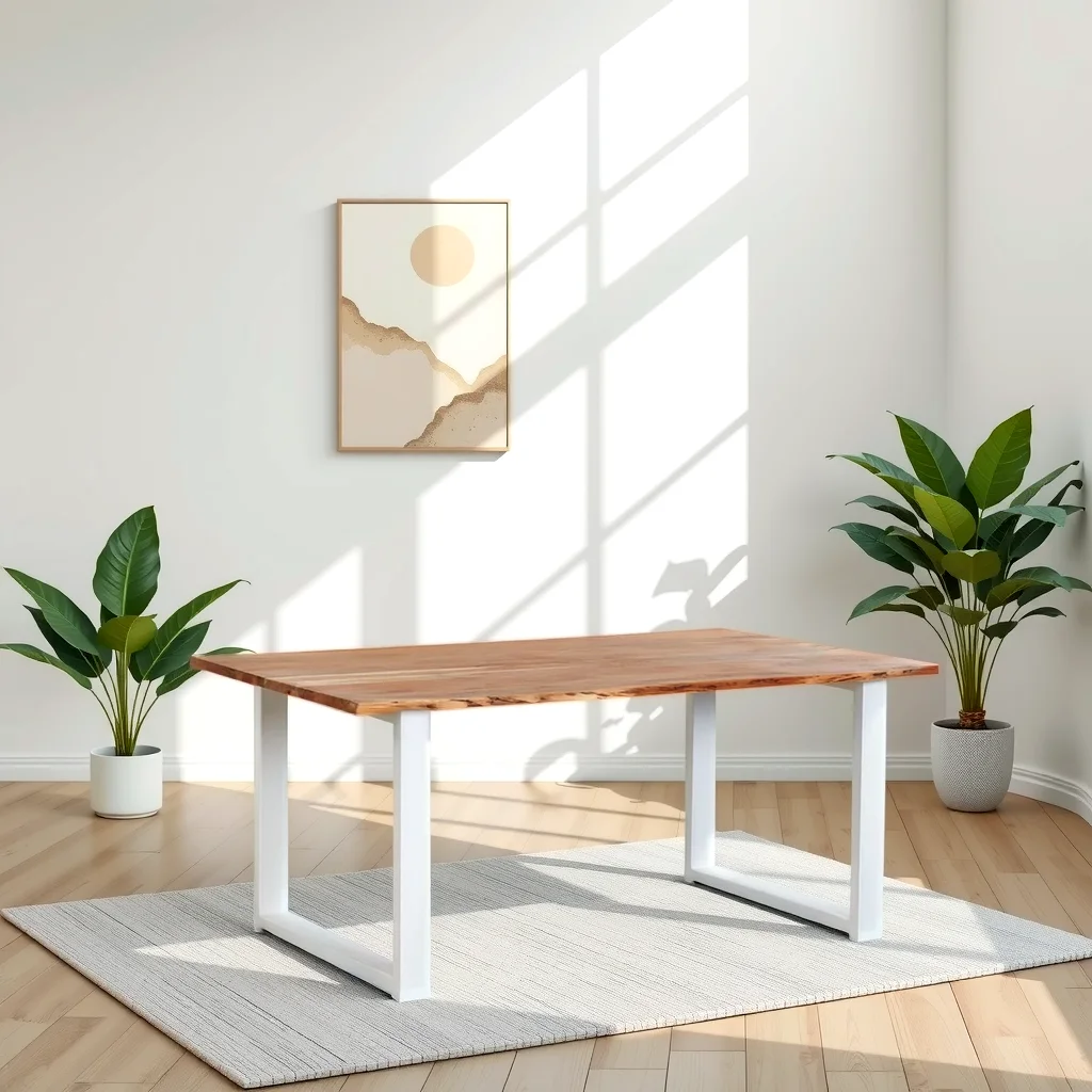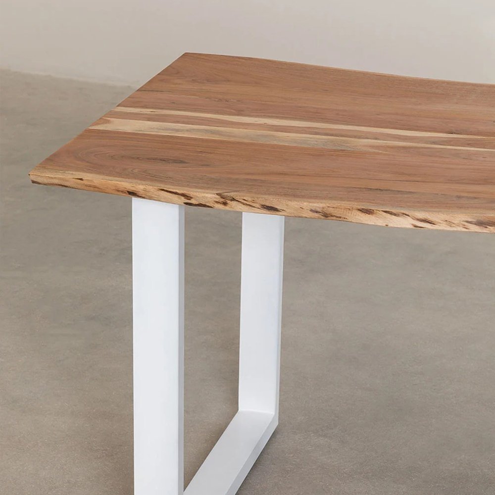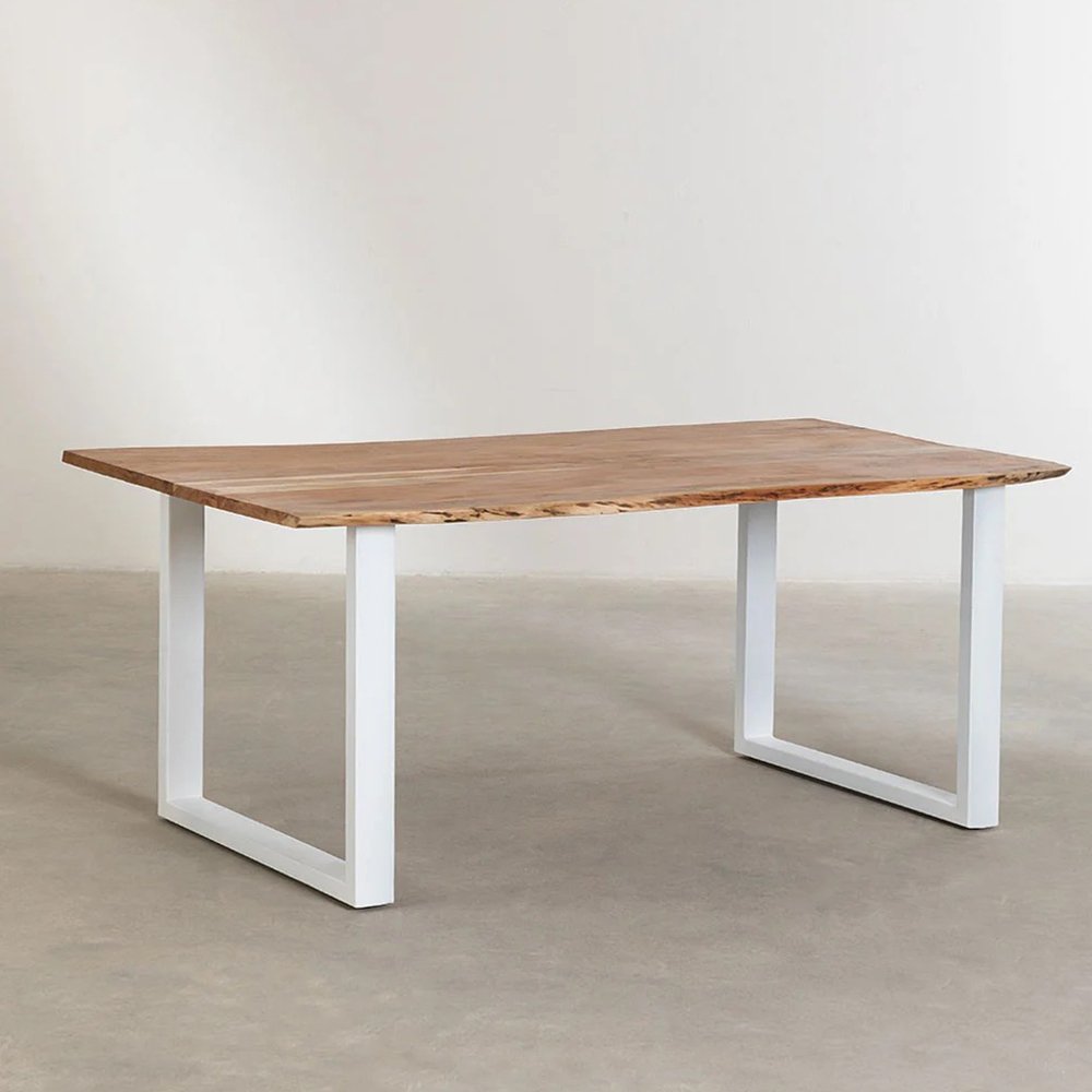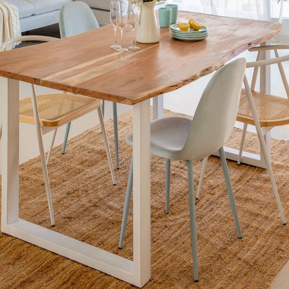 Let the natural charm of your dining room speak for itself with this irresistible piece. The Carmody Live Edge rectangular solid wood dining table (180×100 cm) stands out for its solid wood top, displaying a singular beauty thanks to its unique grains and shades. Each angle reveals a special character, fusing contemporary and rustic styles. The surface, with a natural finish, invites you to share unique moments with family or friends. The cube-shaped metal legs with an elegant white coating, provide that modern touch that enhances the warmth of the top. Ideal for 6 diners, its size of 180×100 cm makes it perfect for cozy gatherings. Being a piece with a marked vintage industrial trend, it is adaptable to different styles of decoration. Carmody Live Edge is a table that you can place in your dining room, kitchen, or meeting room. Make the table the undisputed protagonist of your room.