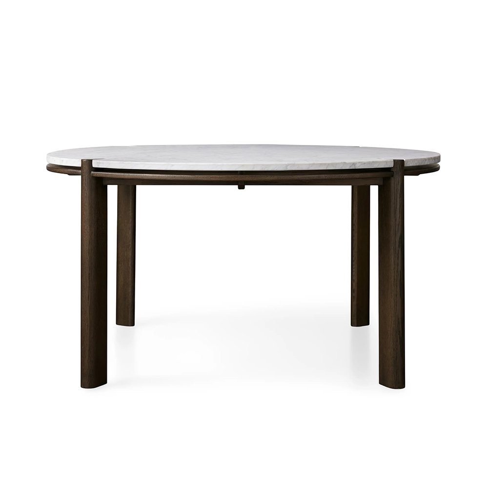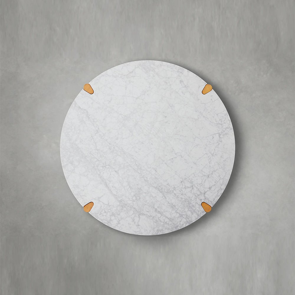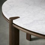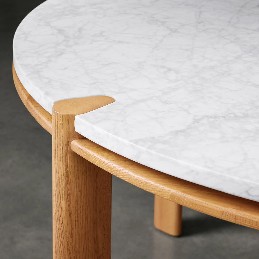 Bases are crafted from solid wood hand-stained with a striking finish and protective lacquer for a subtle sheen. Tops are crafted from natural marble stone solid wood joinery to bases for added strength and stability. Carrara marble is sourced from Rajasthan.