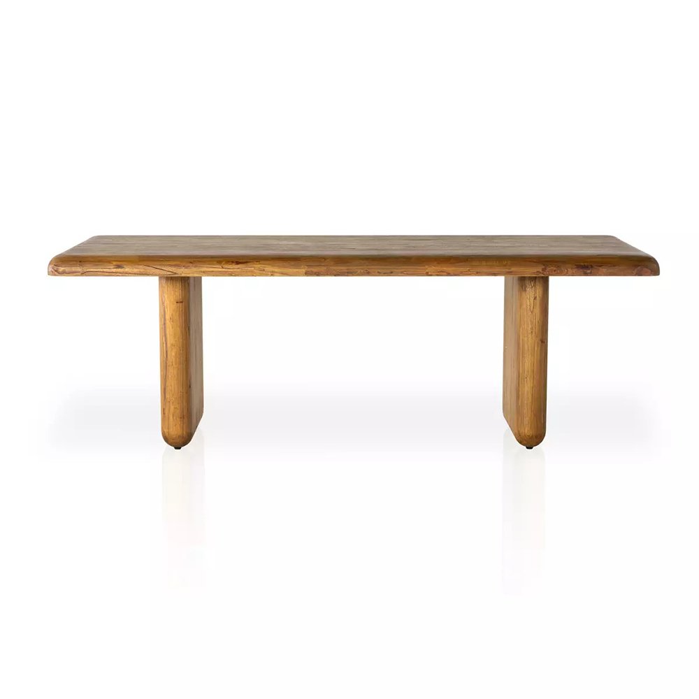 Natural graining and soft, filleted edges lend a handcrafted feel to a voluminously shaped dining table of honey-finished. Seats six comfortably. A solid mango wood dining table exudes a blend of natural beauty, durability, and rustic charm. Crafted from solid mango wood, this dining table stands as a testament to both enduring strength and exquisite aesthetics.