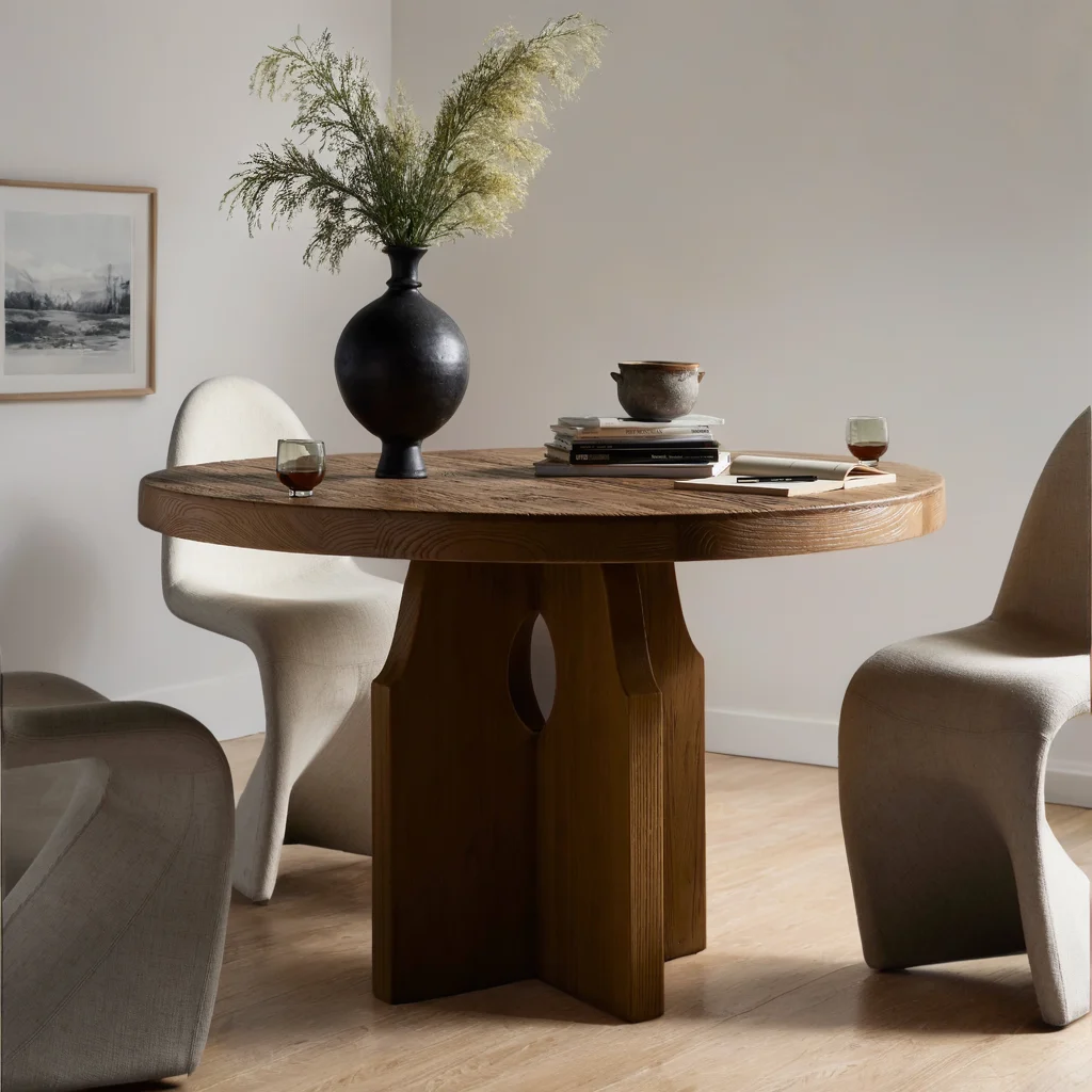 Made from natural Solid Wood with wire brushing for texture, a rounded tabletop, and a cutout base. Seats six comfortably.