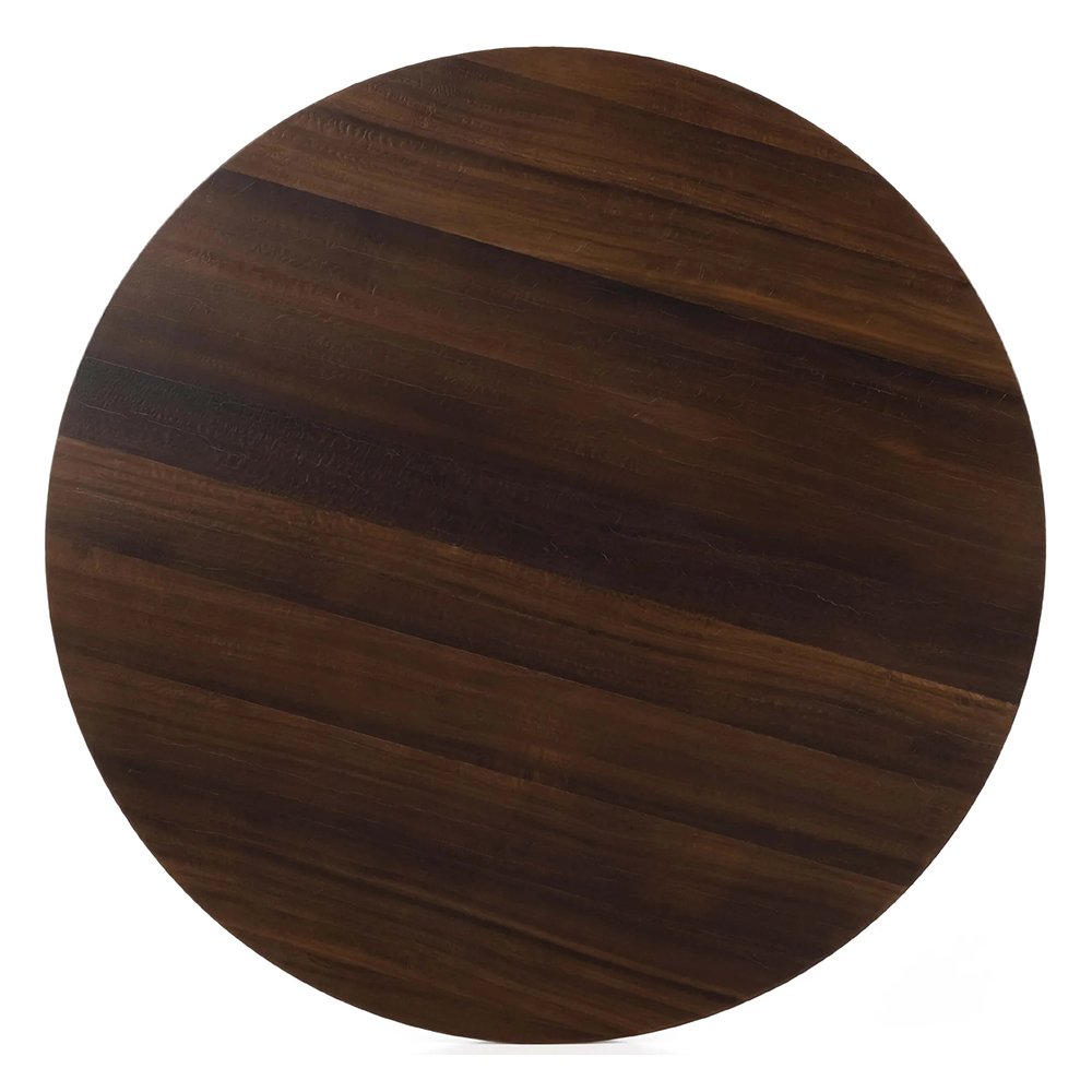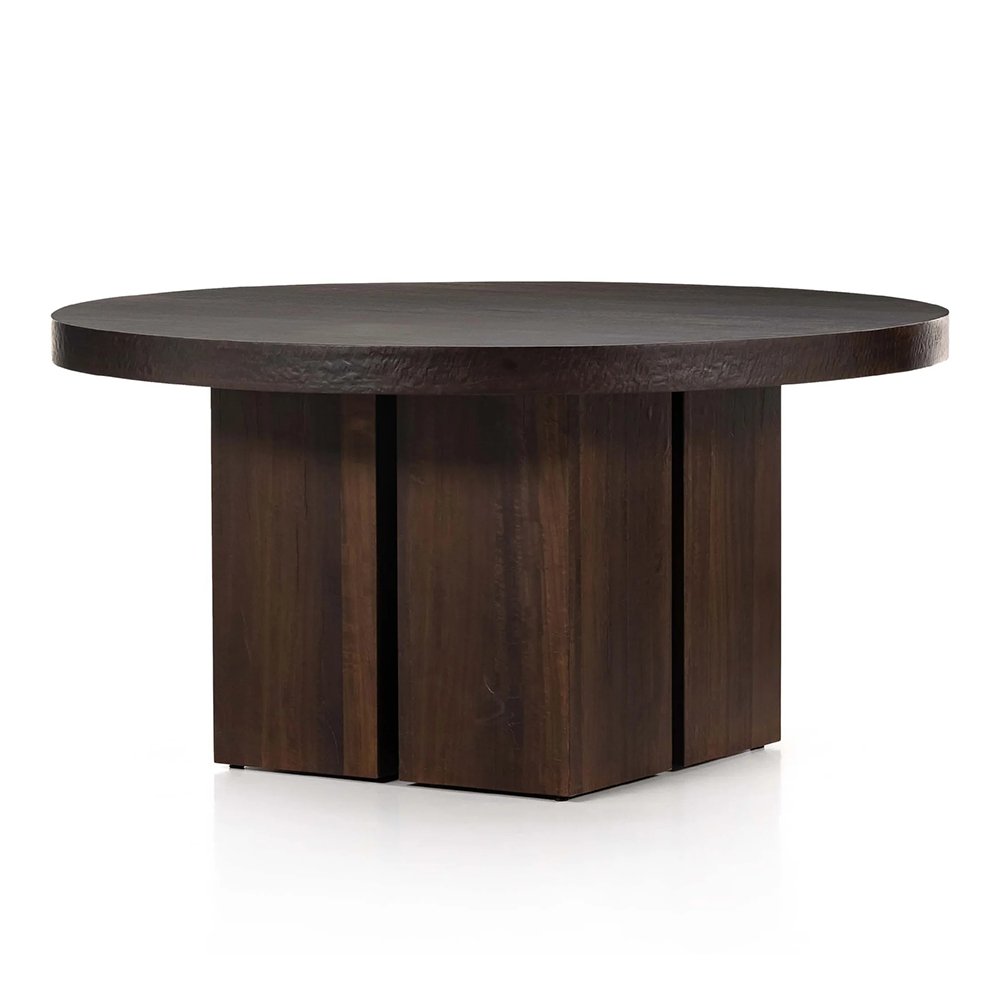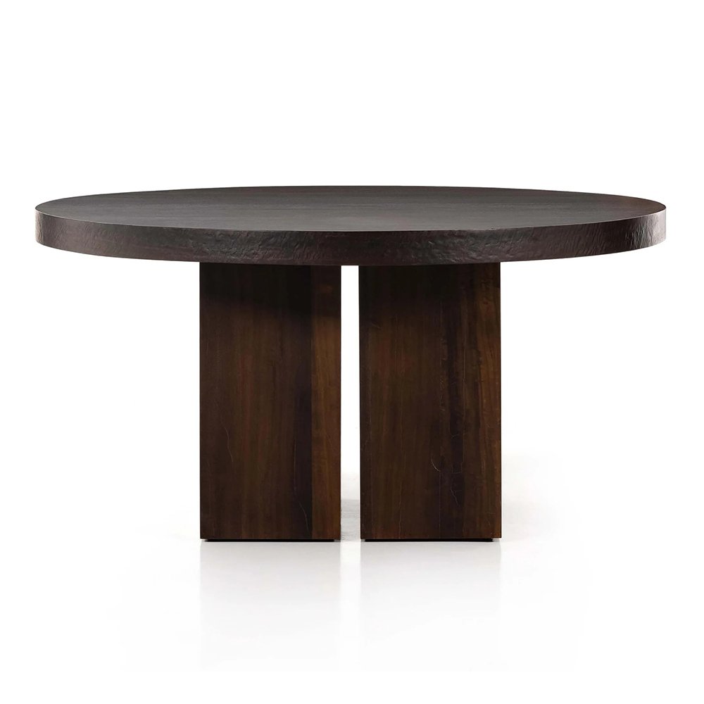Made from Solid Mango Wood with striking highs and lows, an oversized pillar base grounds a rounded tabletop with a wavy grain and smoky tone. Seats six comfortably.