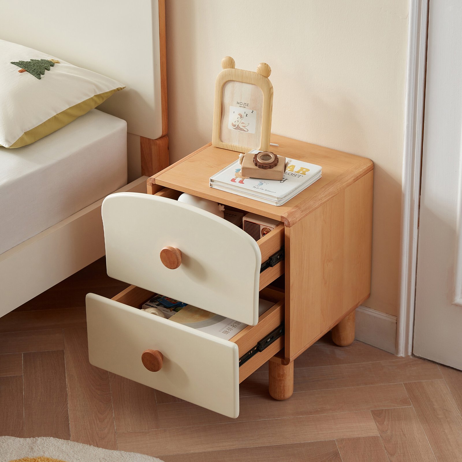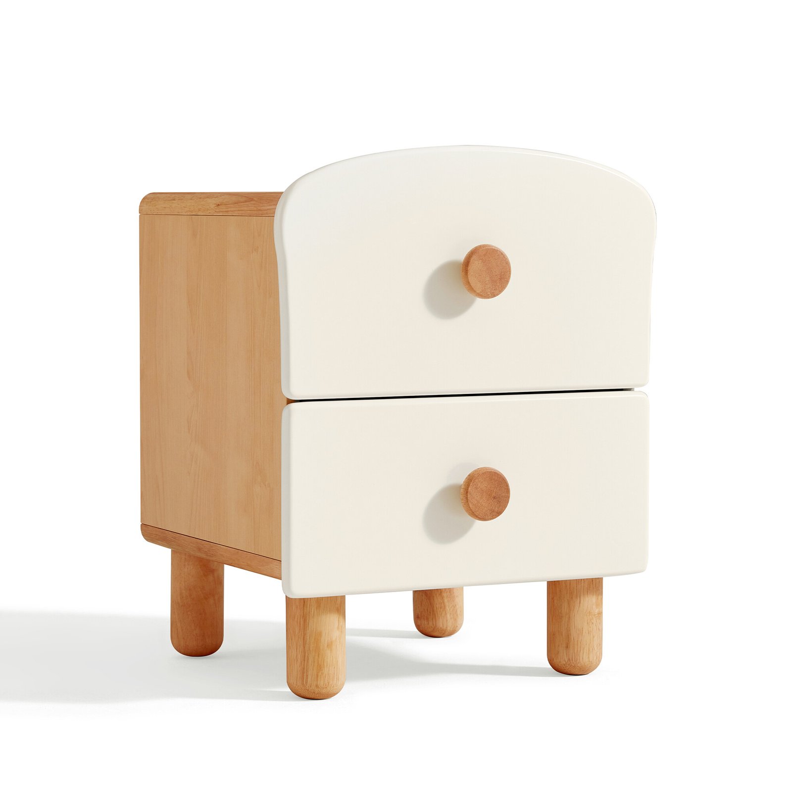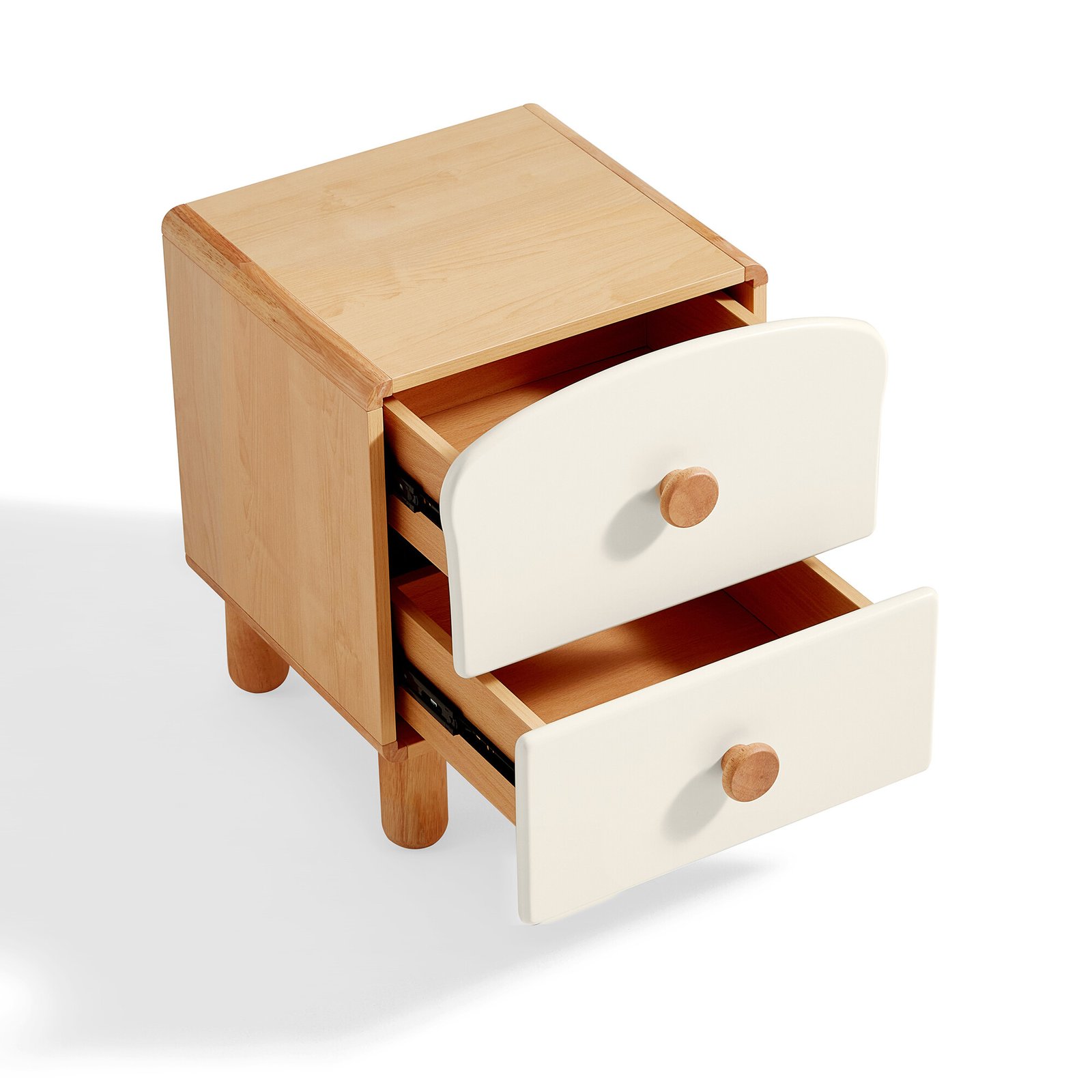 Made from solid wood. Features 2-drawer storage. Smooth and rounded edges to ensure safety. Rounded handle for easy gripping. Odourless and low formaldehyde. Solid wood legs, ensure stability and durability. Item designed to be safe for kids.