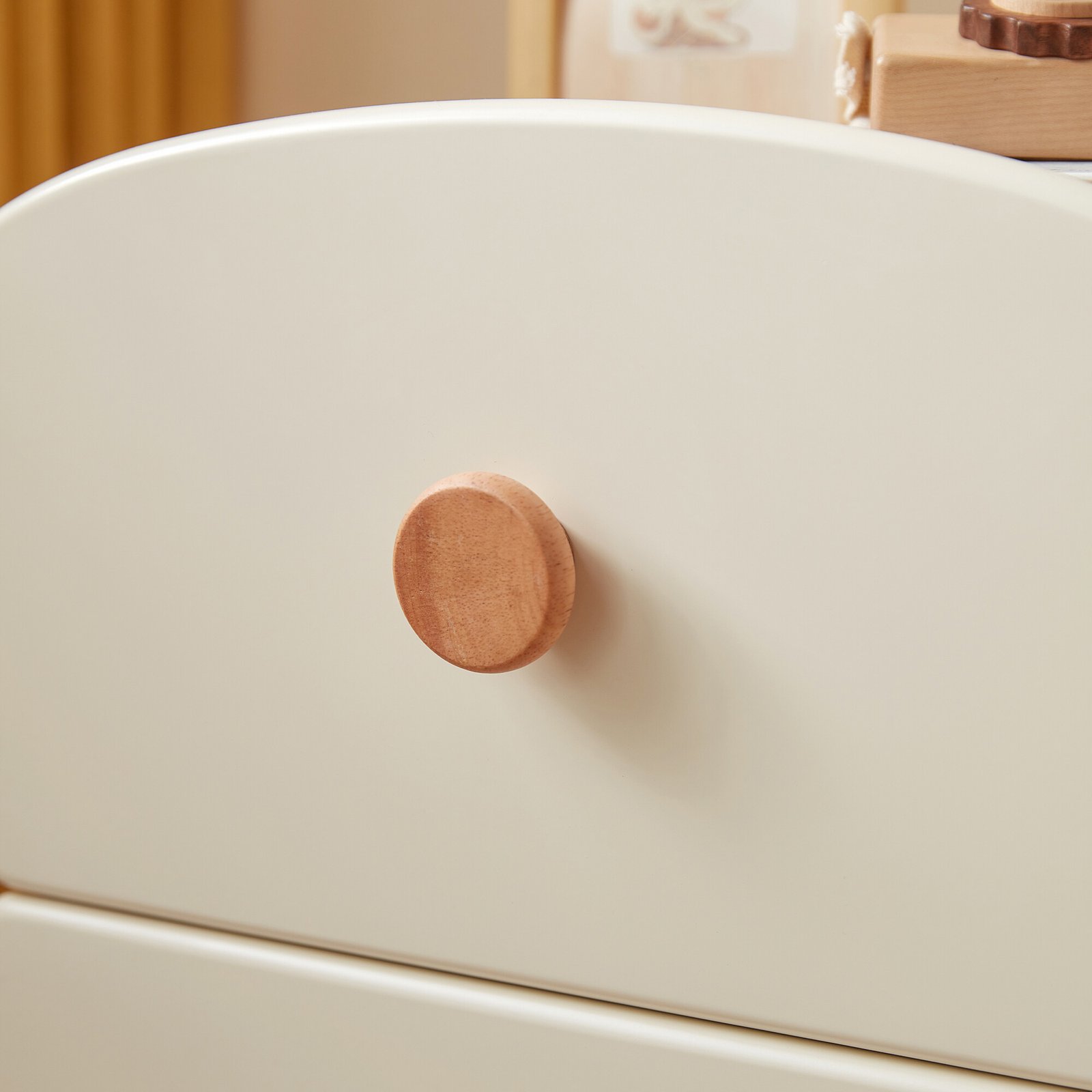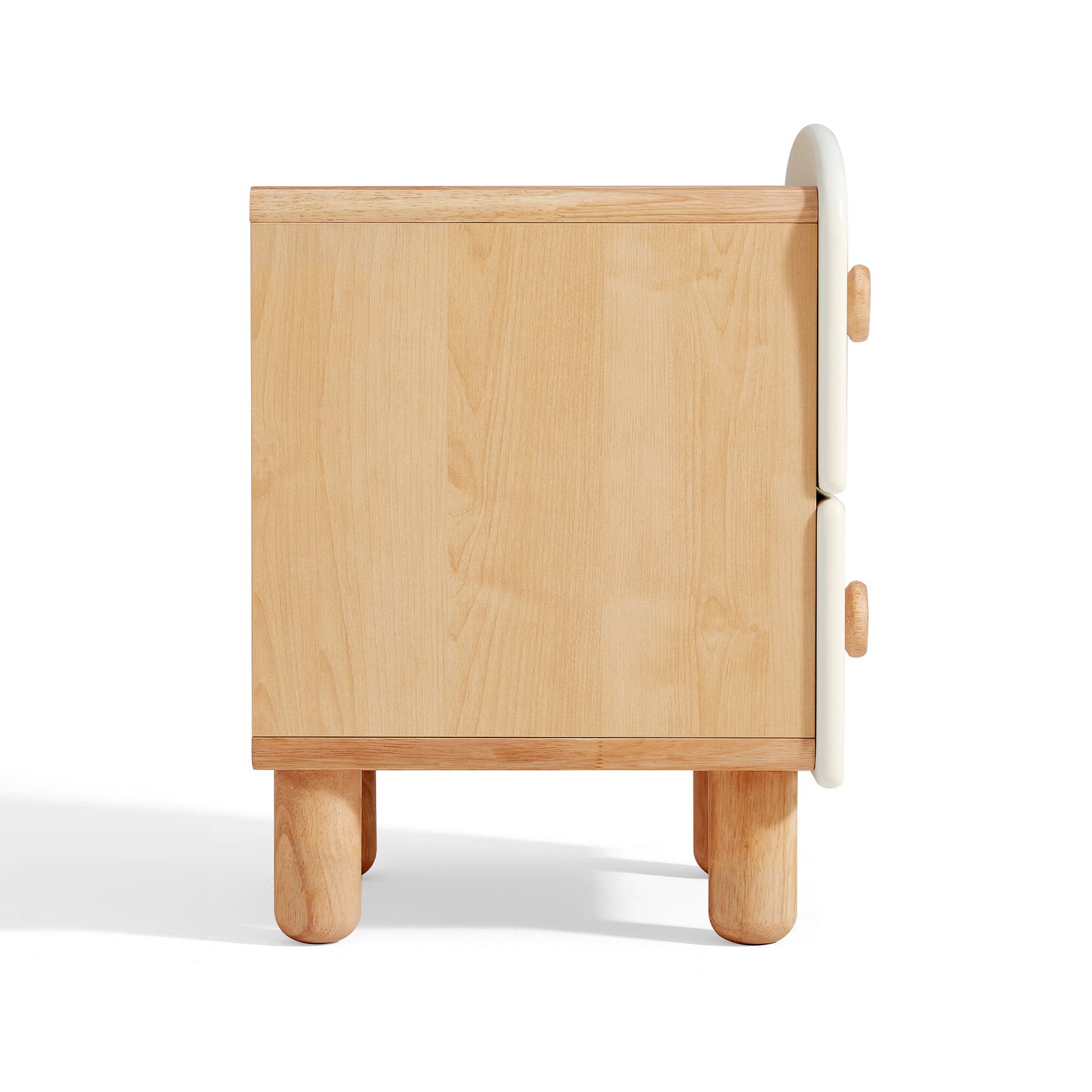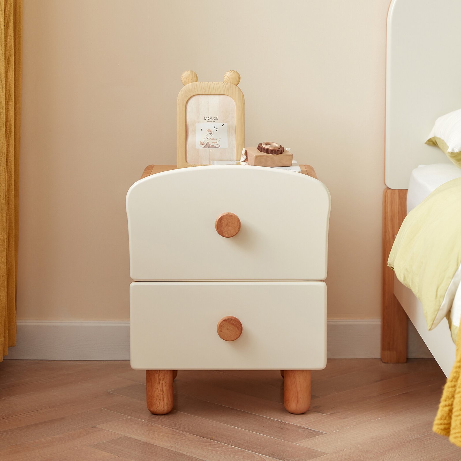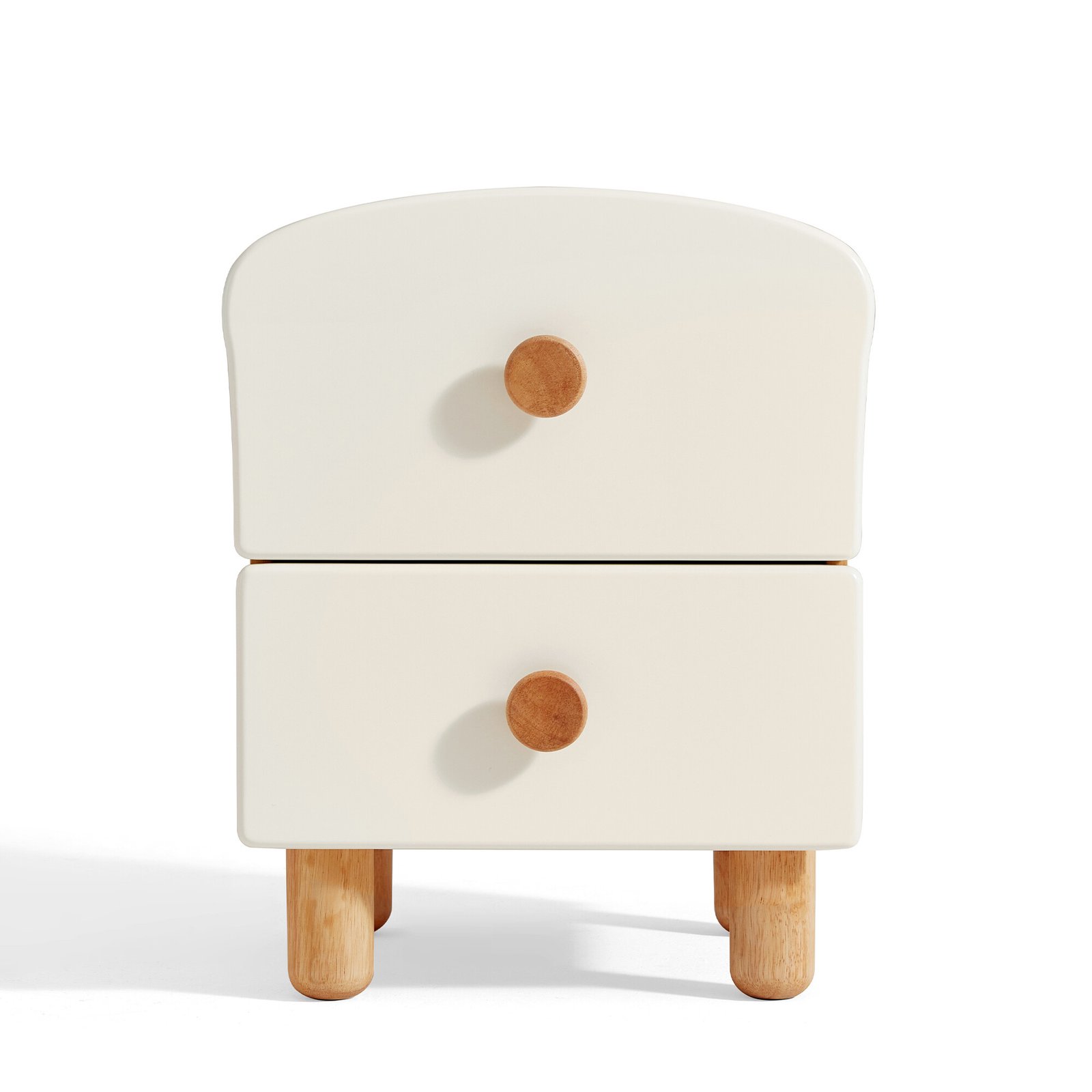 Made from solid wood. Features 2-drawer storage. Smooth and rounded edges to ensure safety. Rounded handle for easy gripping. Odourless and low formaldehyde. Solid wood legs, ensure stability and durability. Item designed to be safe for kids.