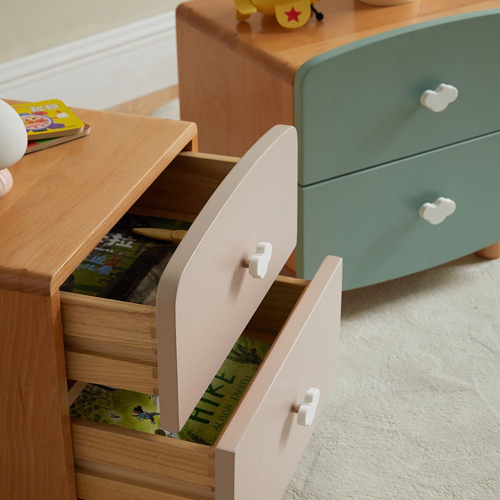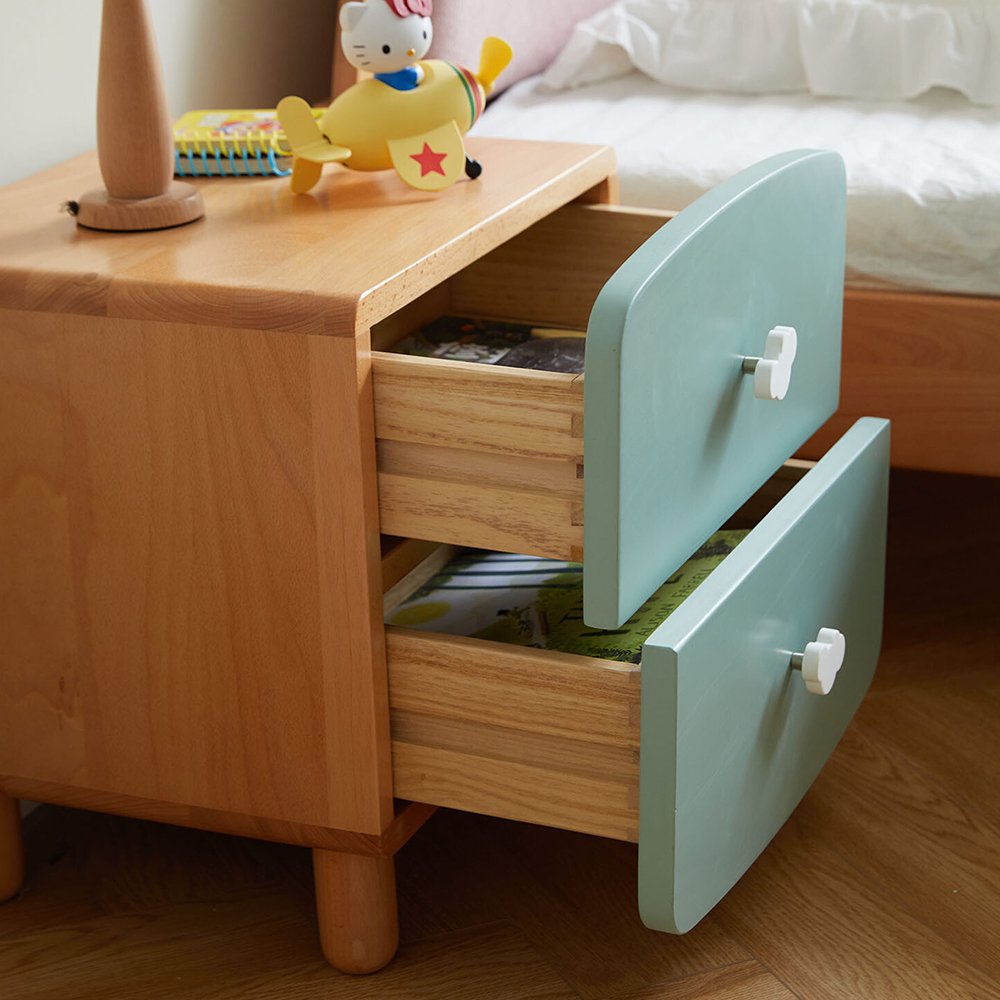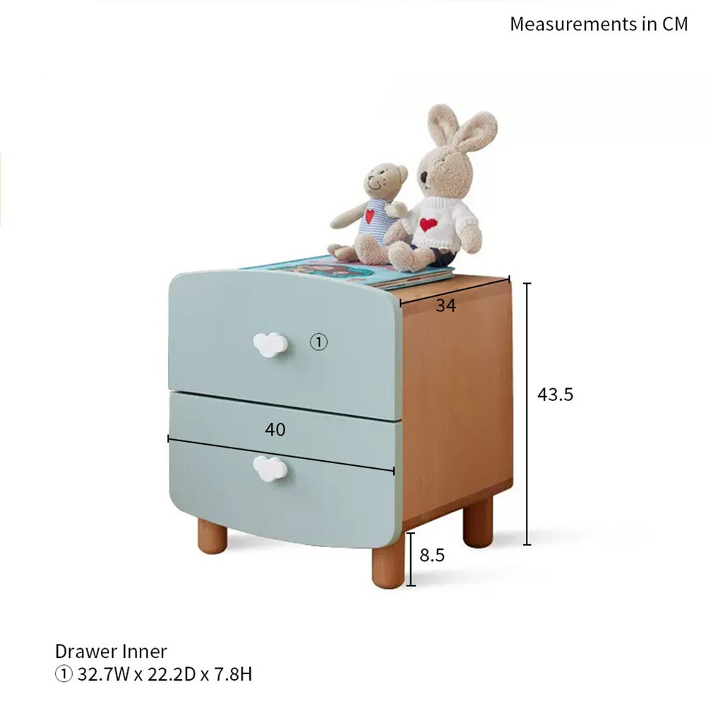 Made from solid wood. Features 2-drawer storage. Smooth and rounded edges to ensure safety. Rounded handle for easy gripping. Odourless and low formaldehyde. Solid wood legs, ensure stability and durability. Item designed to be safe for kids.