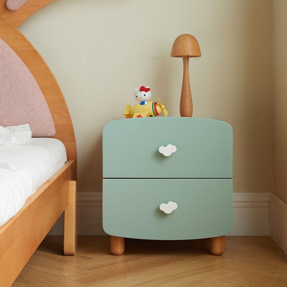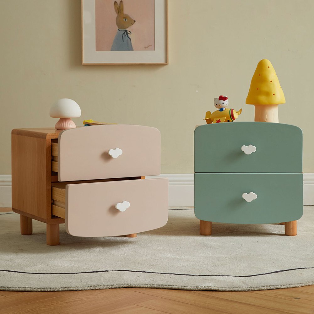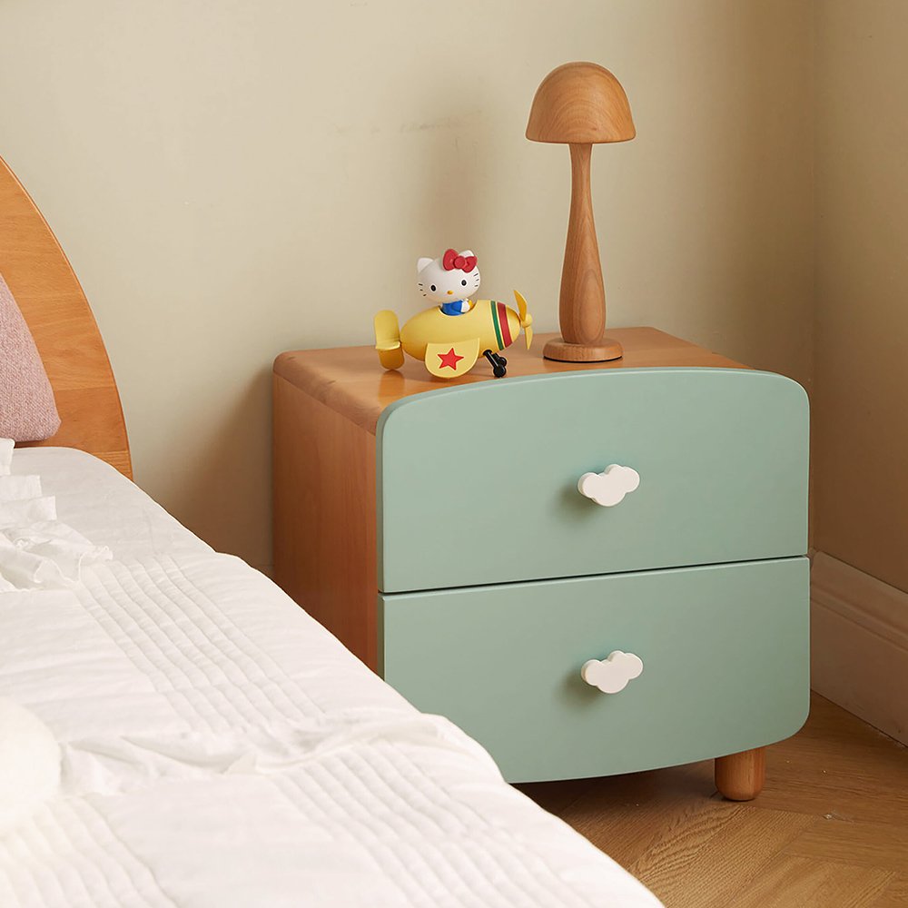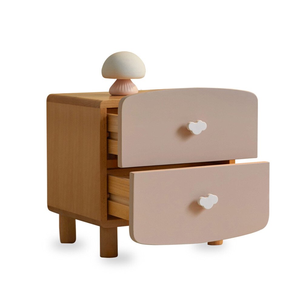 Made from solid wood. Features 2-drawer storage. Smooth and rounded edges to ensure safety. Rounded handle for easy gripping. Odourless and low formaldehyde. Solid wood legs, ensure stability and durability. Item designed to be safe for kids.