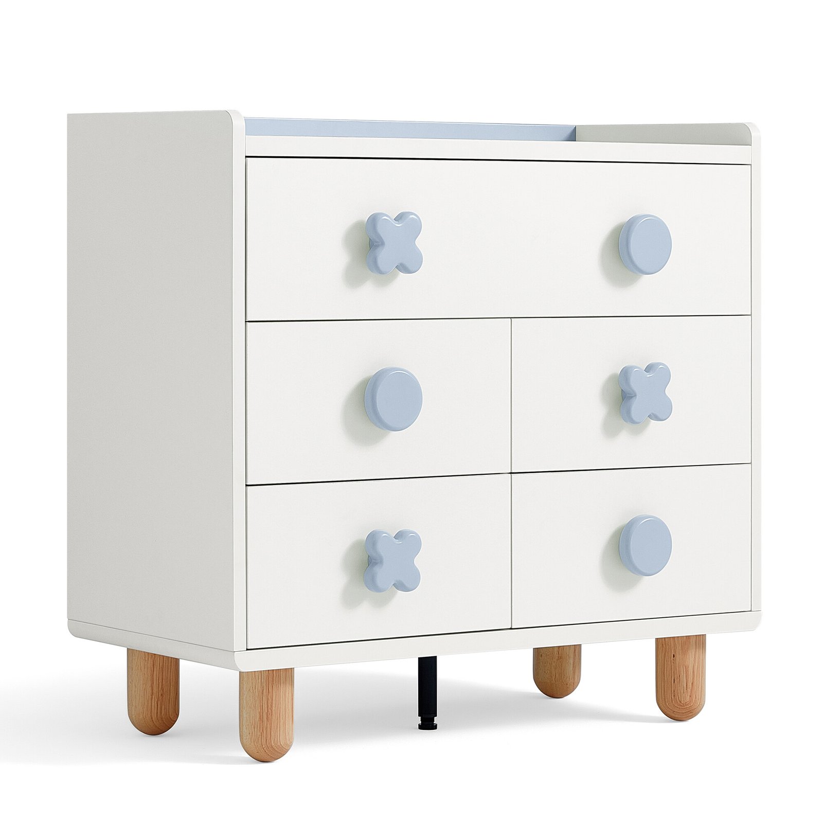 Flutter Ferns Kids Chest of 5 Drawers for the organization of different items. Raised edges on top, to prevent items from falling off. The rounded corner design ensures safety and prevents accidental bumps. They are supported by solid wood legs, providing a strong and stable foundation that ensures long-lasting durability. Lifted legs allow easy access to the floor underneath, simplifying the cleaning process.