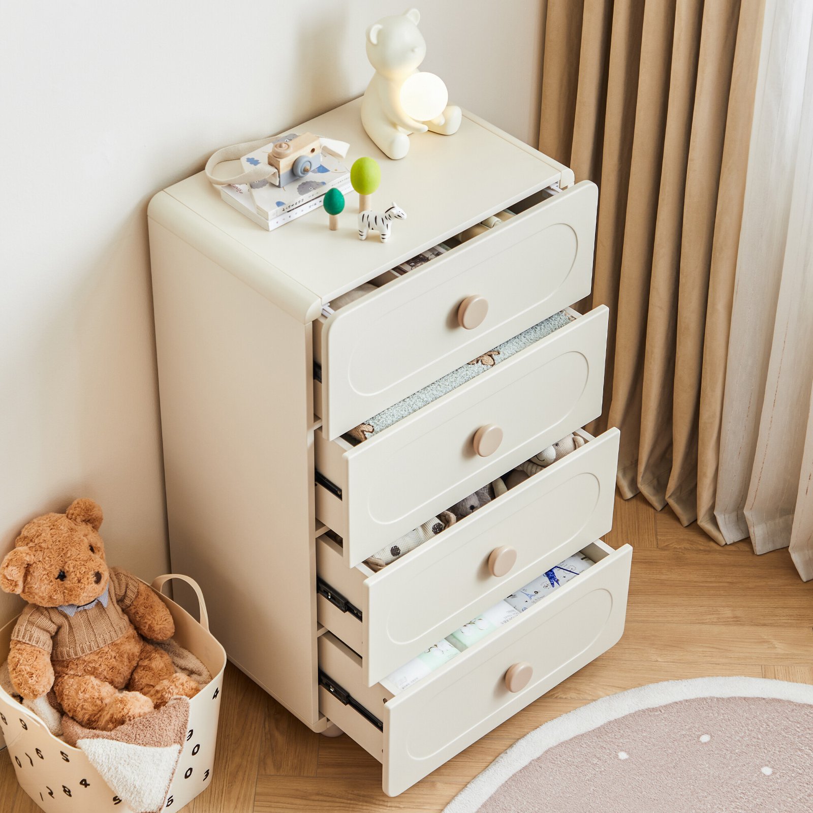 Made from solid wood. Features 4-drawer storage. Smooth and rounded edges to ensure safety. Odourless and low formaldehyde. Equipped with a securing kit. Solid wood legs, ensure stability and durability. Item designed to be safe for kids.