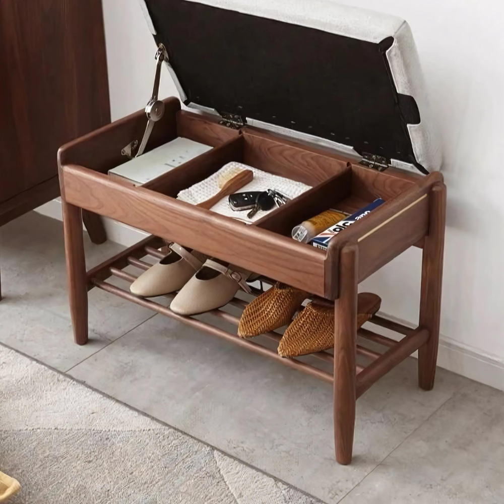 Reserved space for shoe brushes and polishes Lift the soft stool surface, and immediately hide the storage compartment, making it easier to find items. Avoid hallway clutter.