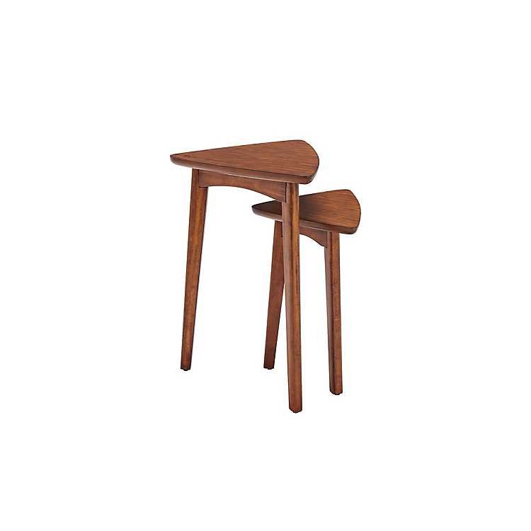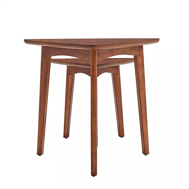 Bring warmth and mid-century modern style to your living space with our set of Amberstone Triangular Accent Tables! Their slim, angular design is perfect for sprucing up small corners.