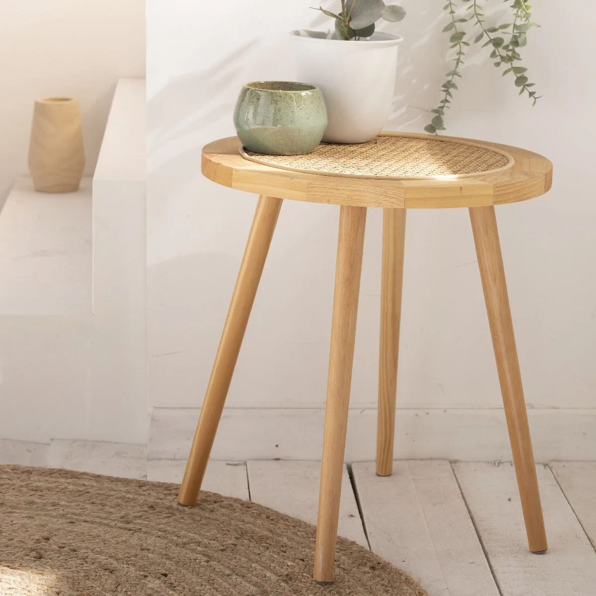 A Dewhaven Side Table with Cane Work is a simple yet functional piece of furniture primarily designed for sitting or resting your feet. It is typically compact in size.  The stool’s frame is made from solid wood, which means it is formed from a single piece of wood or constructed using thick wooden pieces.