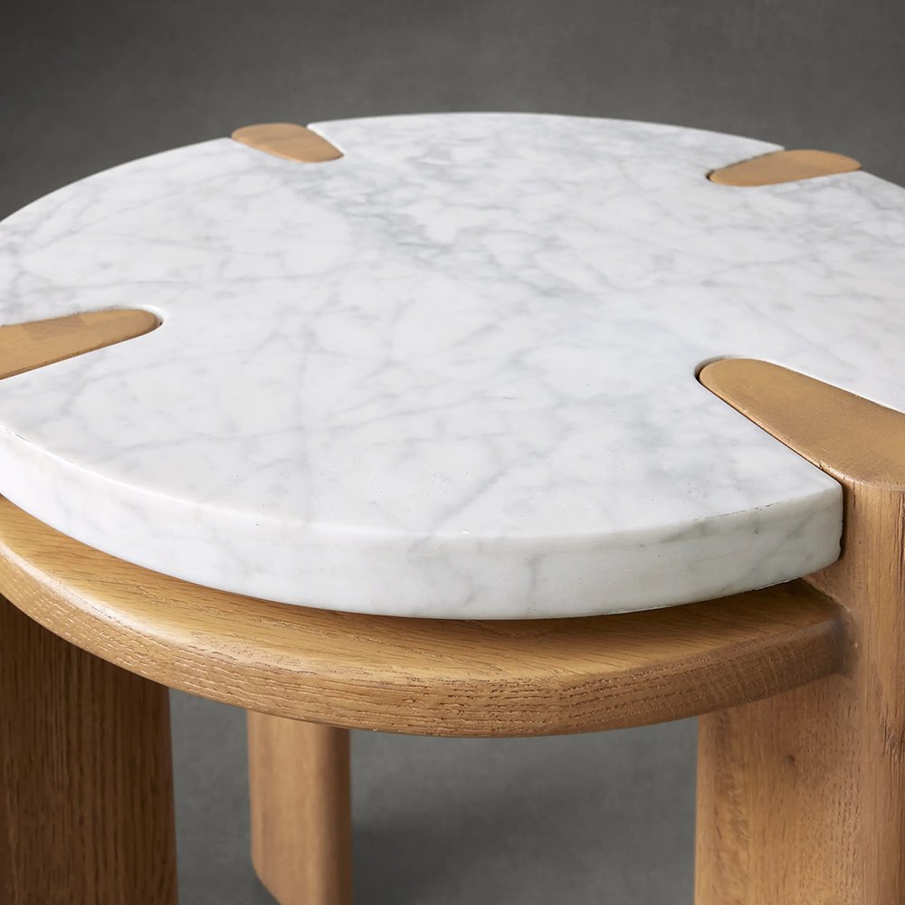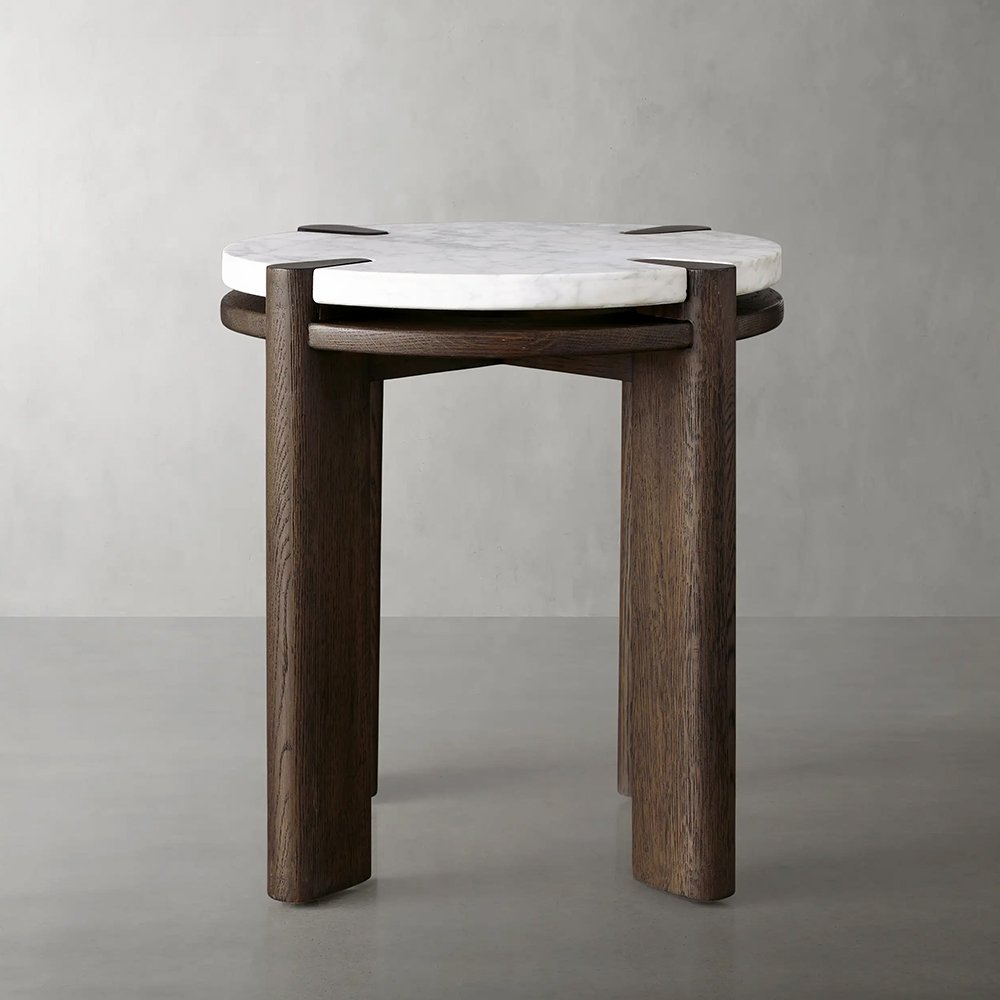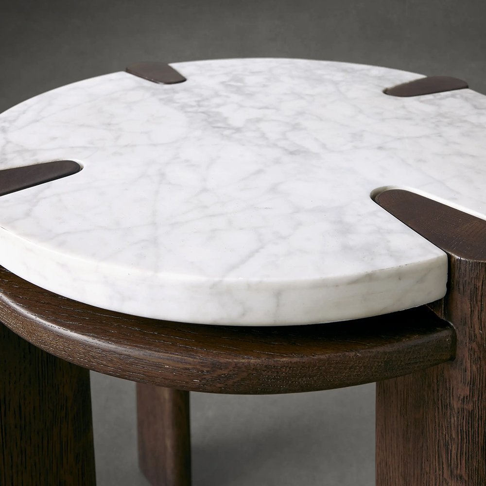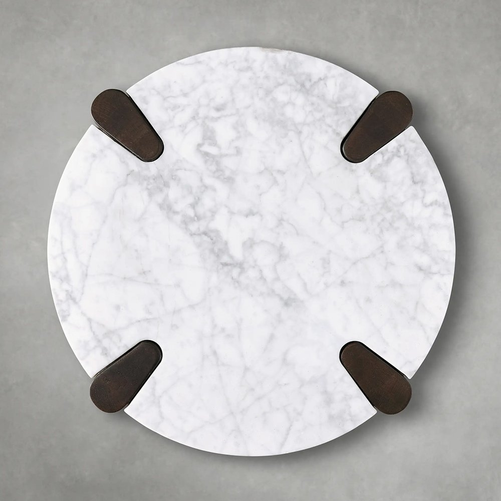 Pyet Side Table with Marbel Top bases are crafted from solid wood hand-stained with a striking finish and protective lacquer for a subtle sheen. Tabletops are crafted from natural marble stone and solid wood joinery to bases for added strength and stability. Carrara marble is sourced from Rajasthan.