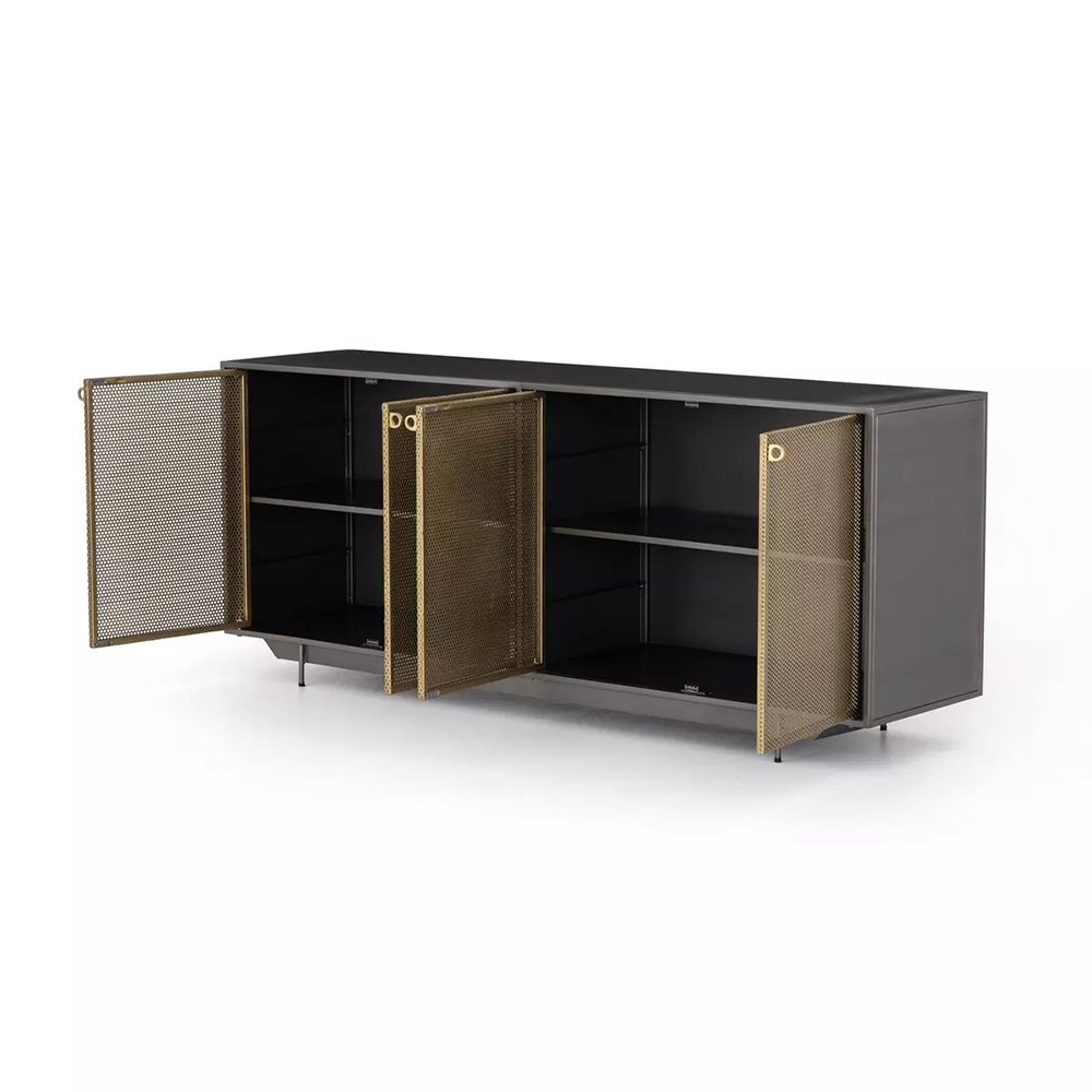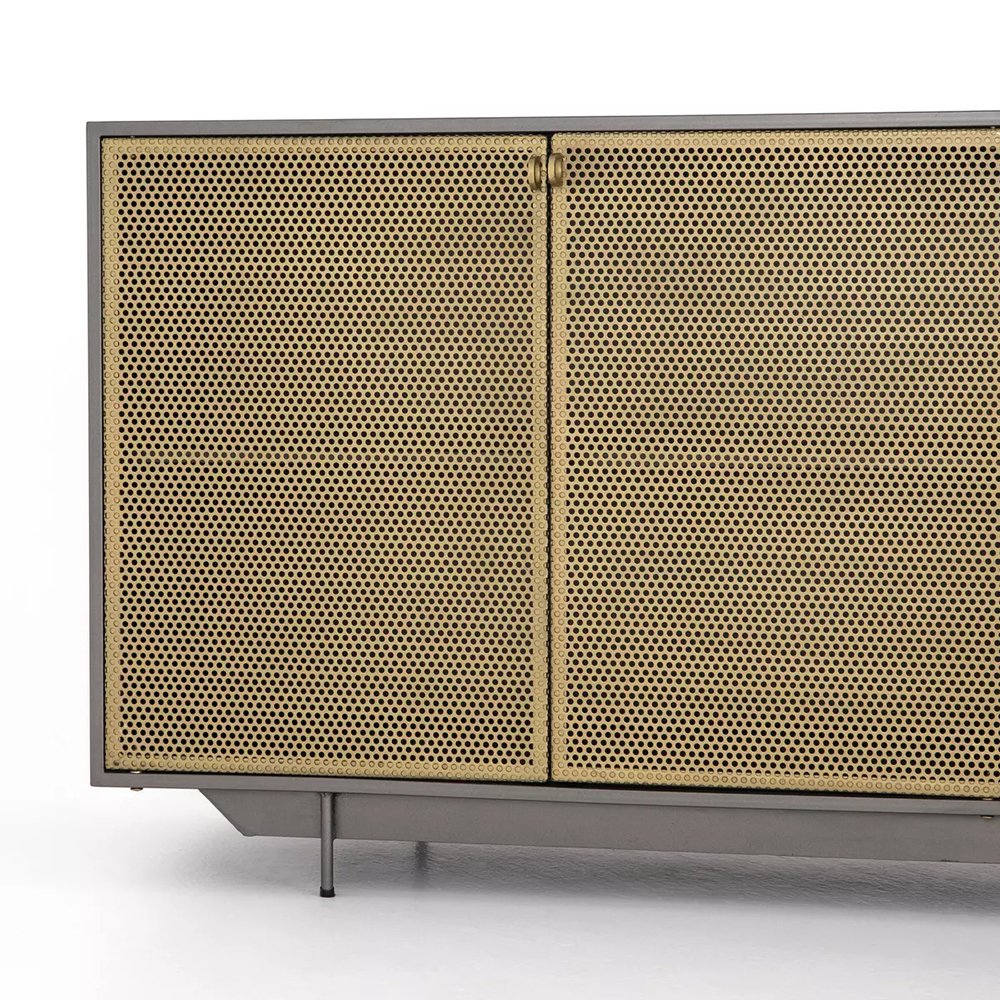 A texture-rich take on streamlined shaping. Mid-century form undergoes a modern refresh via cutting-edge materials and trend-forward finishes. Angular iron framing welcomes front-open cabinetry of perforated brass, as ring-style hardware adds a unique finishing touch.